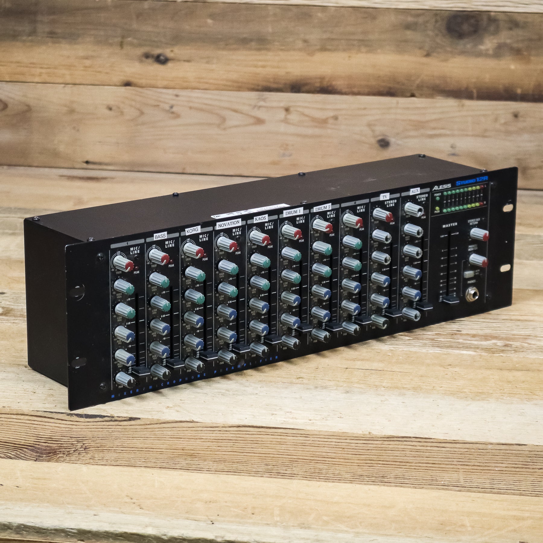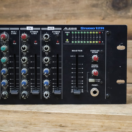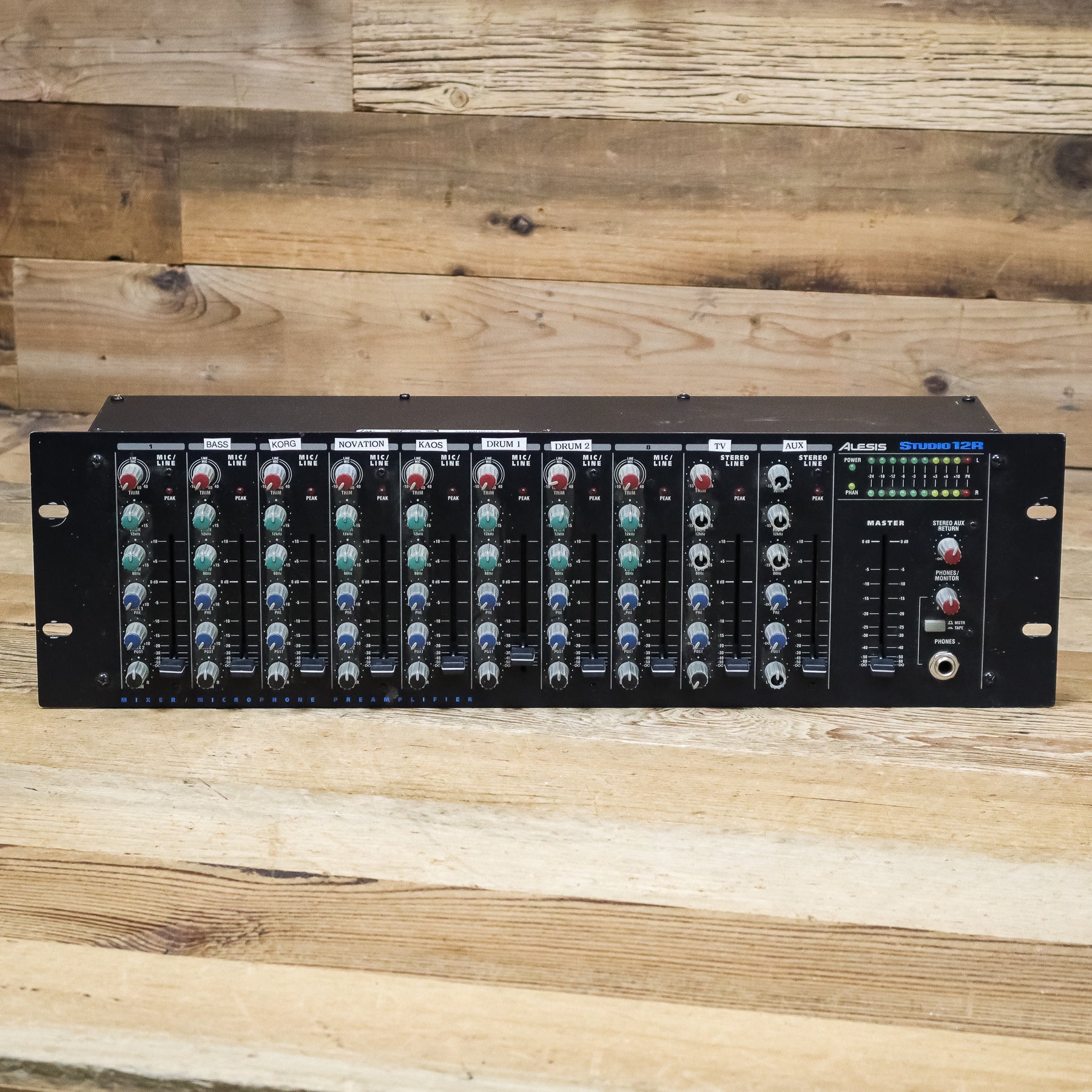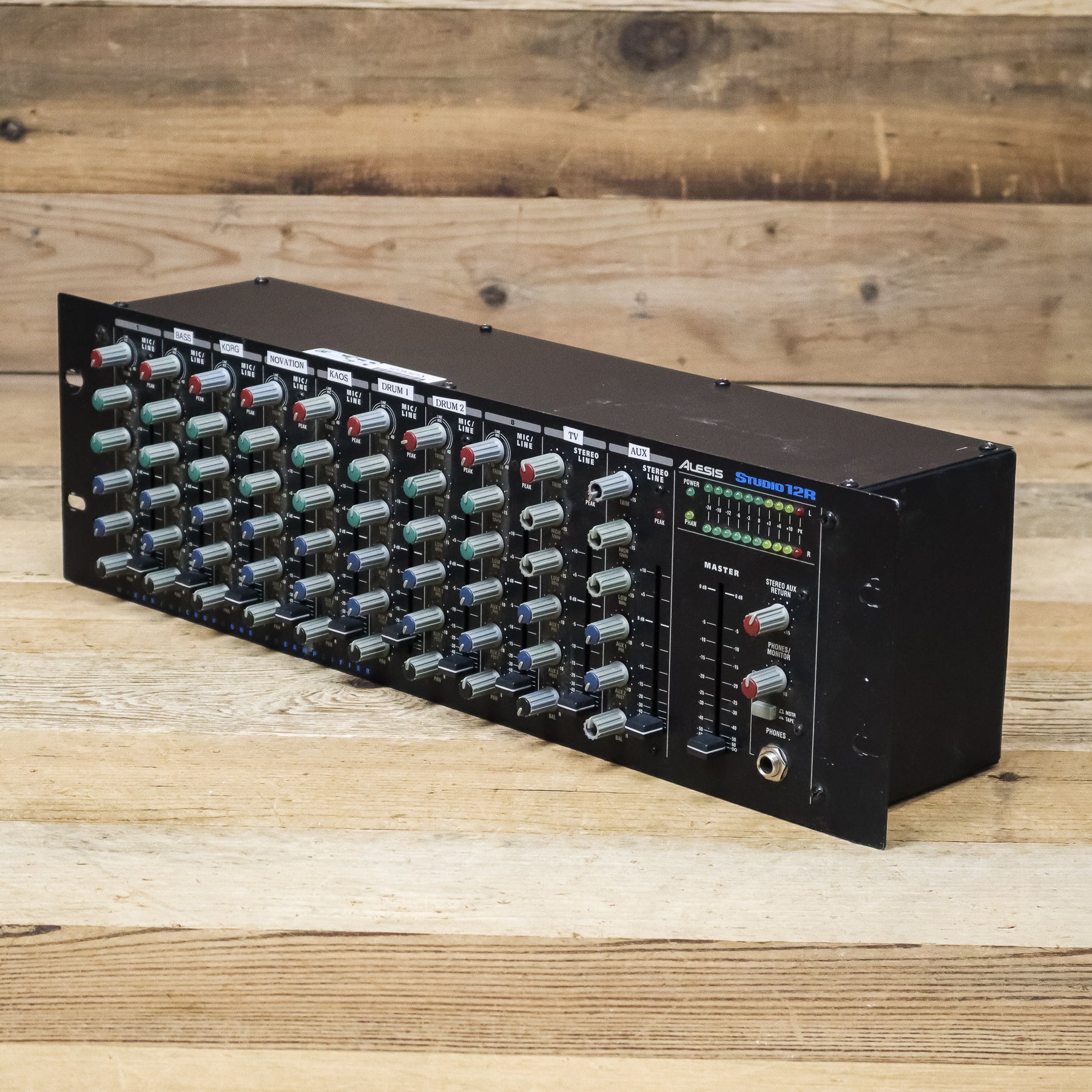 The Alesis Studio 12R is a high-quality, rack-mountable 12-input, stereo output audio mixer. It is designed to handle eight microphones, two stereo line inputs, and to route signal to and from external effect processing devices. As a basic, easy to understand mixer, it can be used in a wide variety of applications from sound reinforcement to multitrack recording. It may also be used as an accessory or submixer to a larger console.