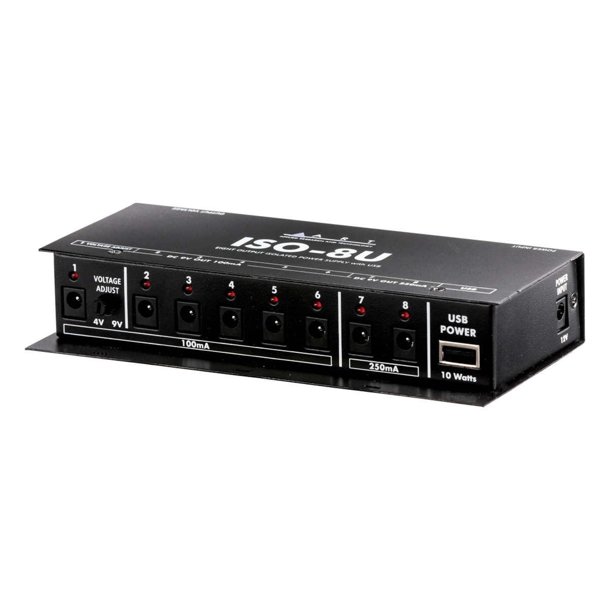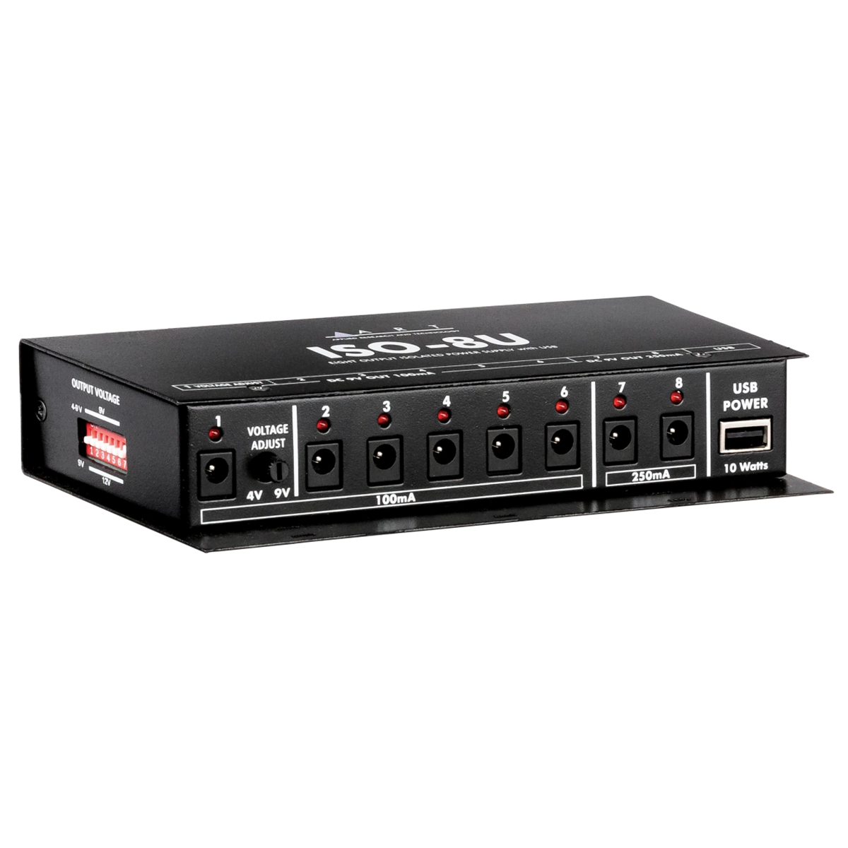 The ISO-8U is a compact pedalboard power supply with eight isolated DC outputs and a 10-watt USB port.