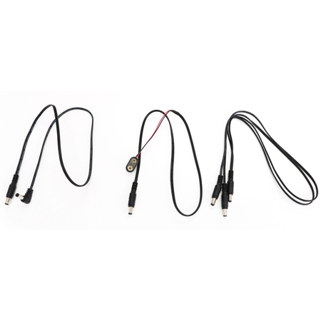 It comes with a variety of cables, including a battery clip, reverse polarity, and Y cable for connecting two outputs to a pedal that requires 18 or 24 volts.