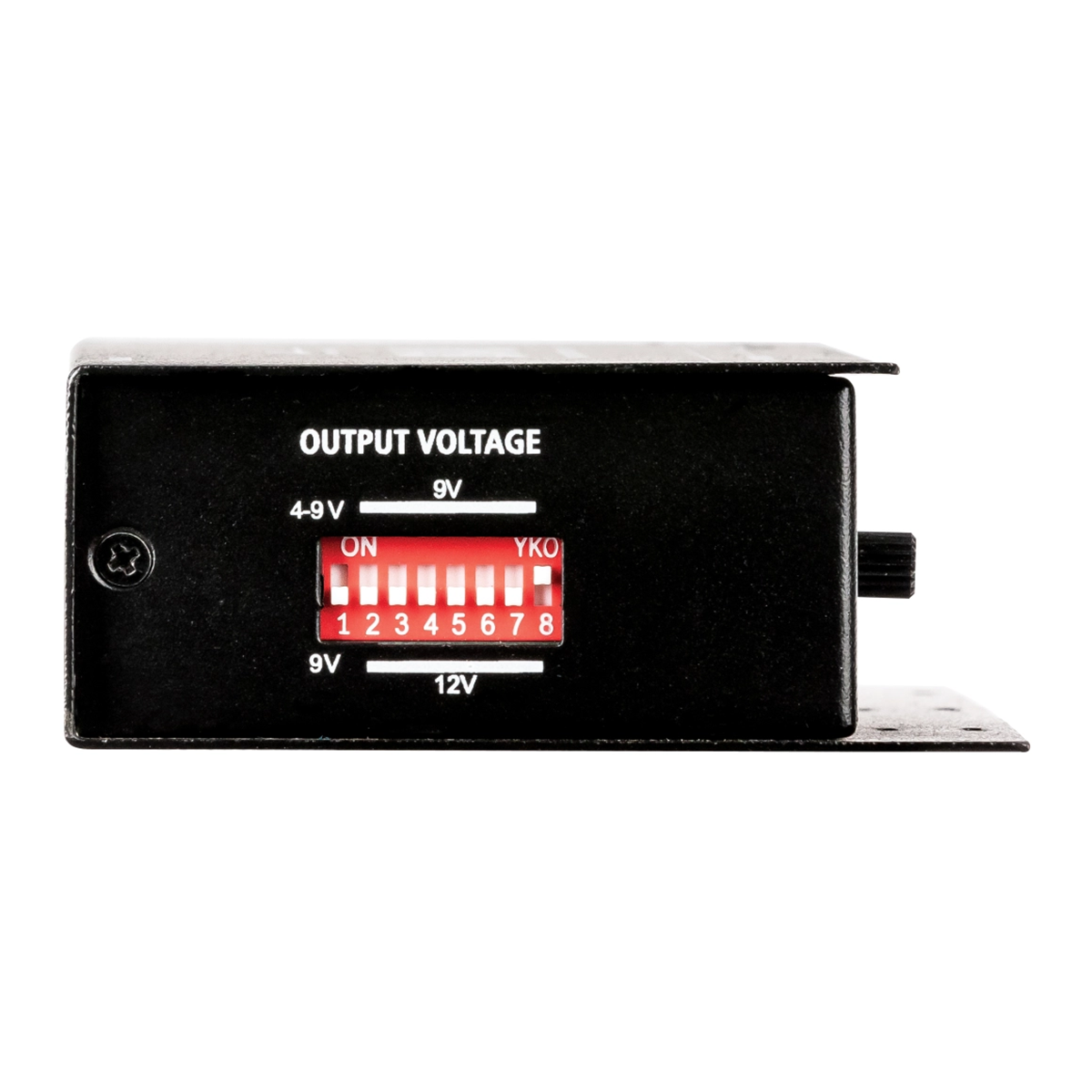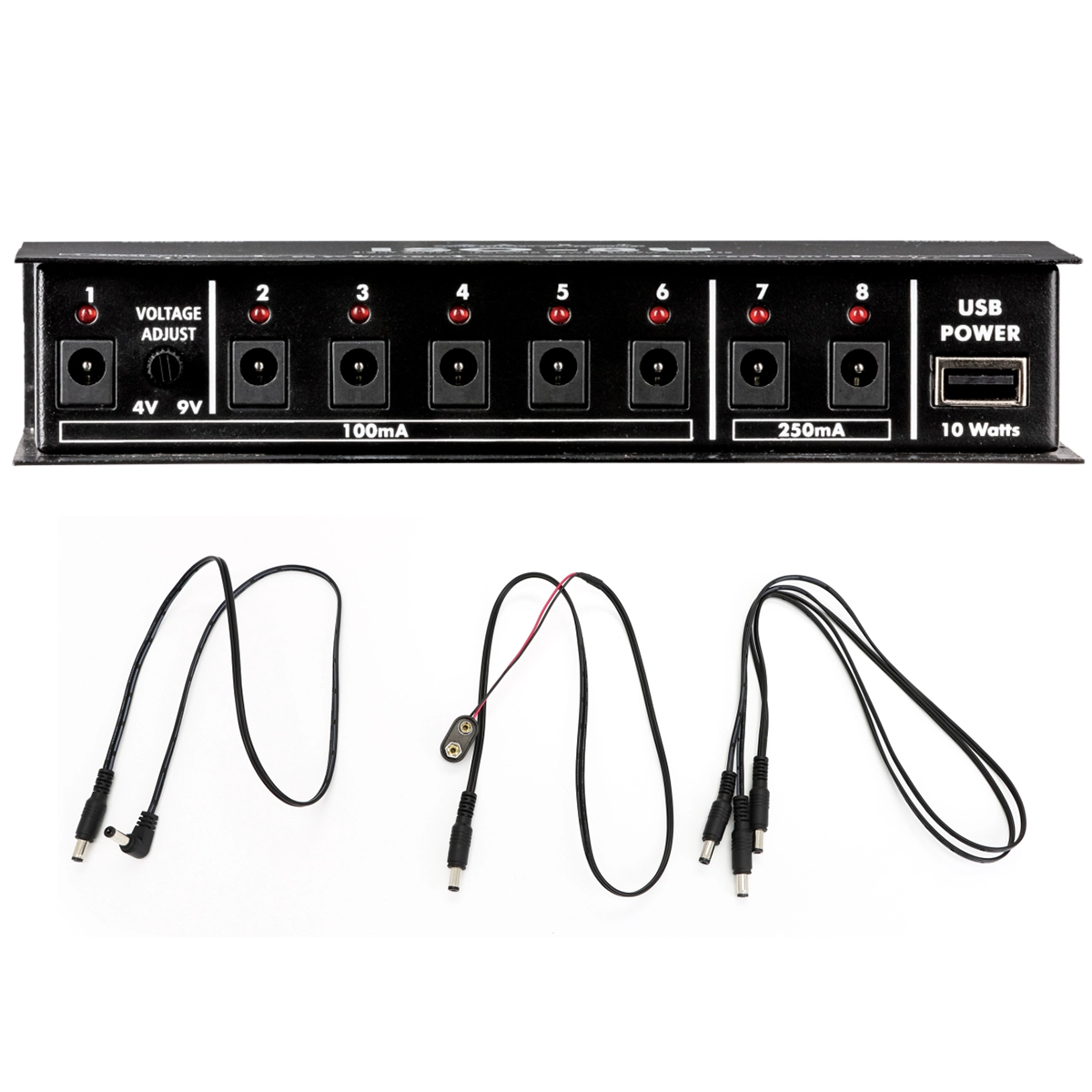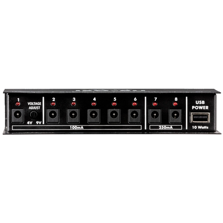Six outputs provide 100 mA, two provide 250 mA, and all have two selectable modes. Output 1 can deliver a fixed 9 volts or variable output down to 4 volts, for the "low battery" effect that can change the response of analog pedals. Try it with your favorite fuzz! The other outputs can switch between 9 and 12 volt operation for pedals that can accept higher voltage for increased headroom.