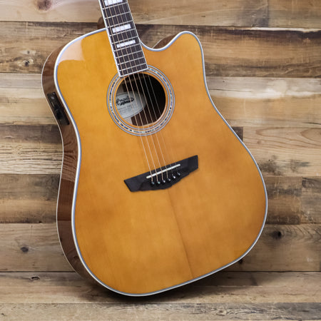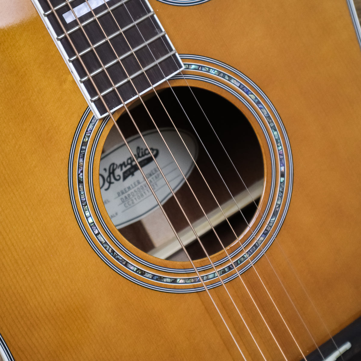 This used D'Angelico Premier Bowery Acoustic Electric Guitar comes in a Vintage Natural finish.