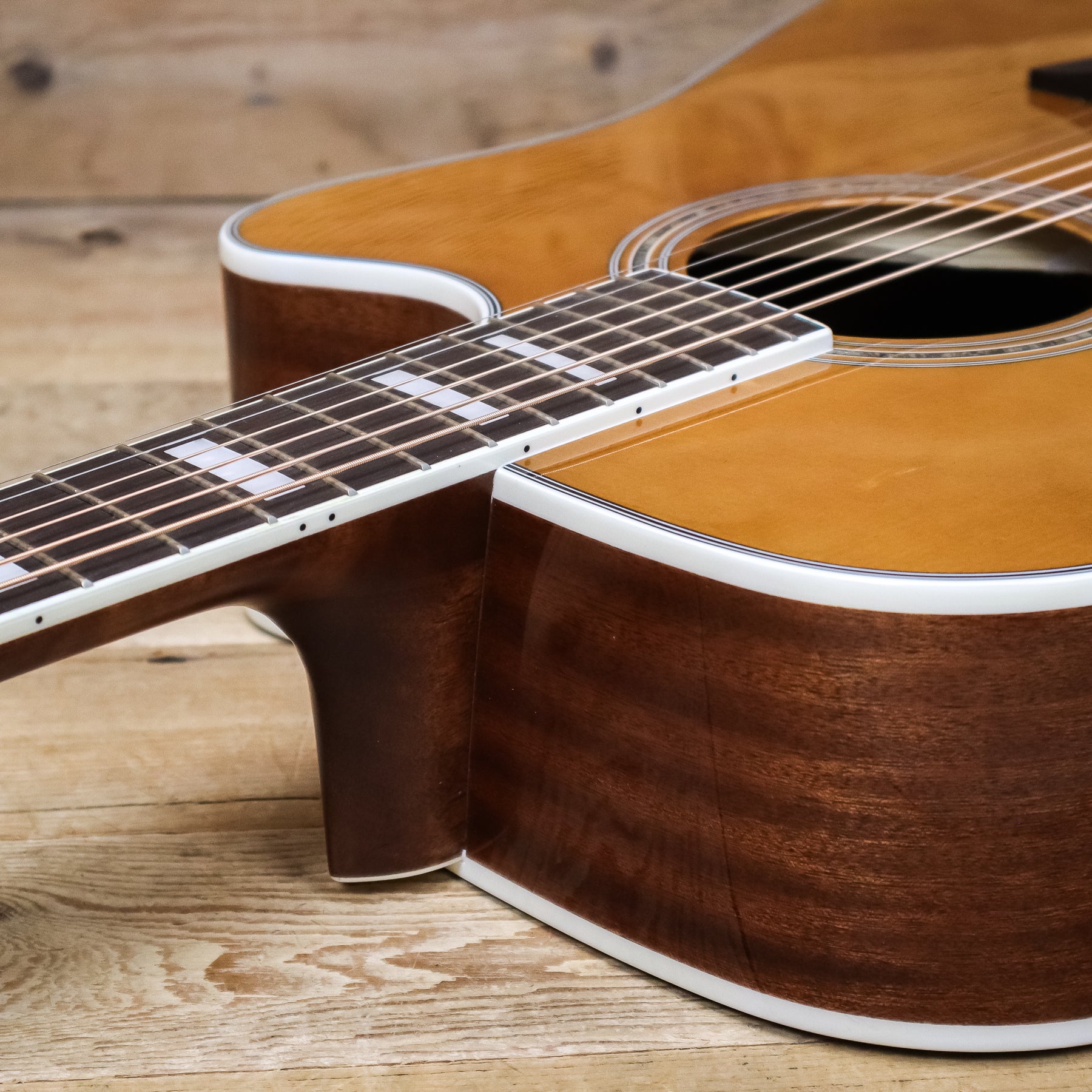 A solid spruce top offers rich, resonant tone, while a slim, satin-finished mahogany neck offers exceptional playablity and prevents the fretting hand from sticking to the neck.