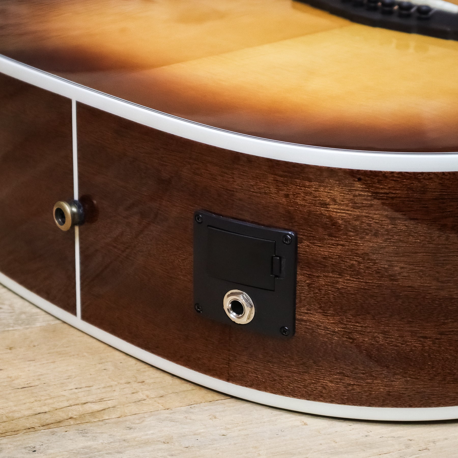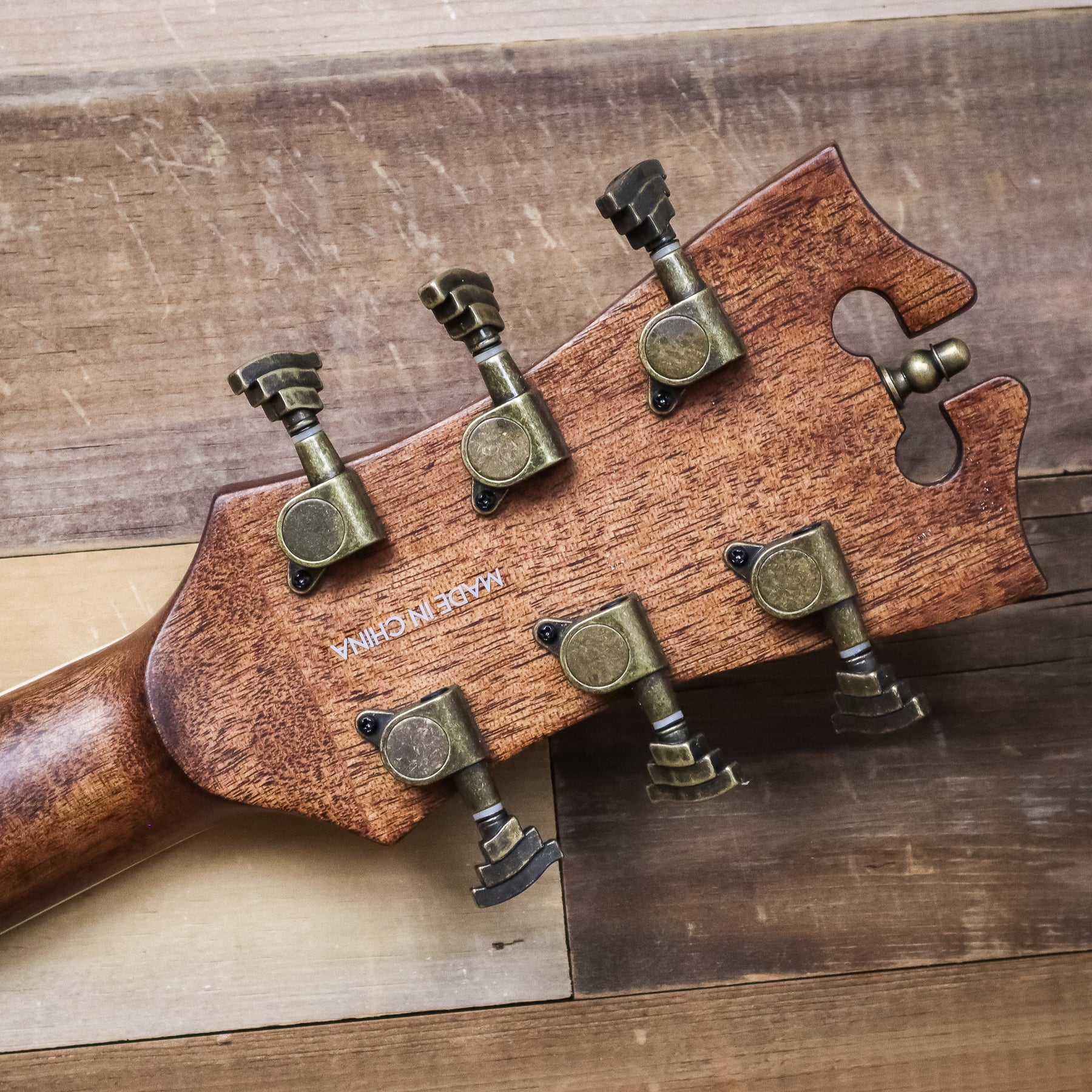 A solid spruce top offers rich, resonant tone, while a slim, satin-finished mahogany neck offers exceptional playablity and prevents the fretting hand from sticking to the neck.