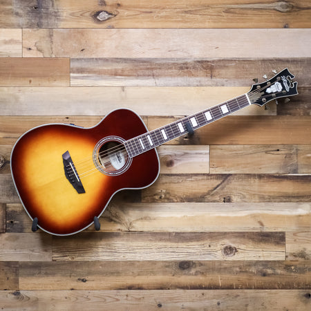 The new Premier Tammany brings the subtler Art Deco stylings of mid-century New York to a classic OM acoustic, featuring a contrasting top pinstripe, archtop-inspired Scalini pickguard, and Antique Bronze hardware. Offering tremendous quality at an accessible pricepoint, the Tammany features a solid spruce top, laminated mahogany back and sides, and a Fishman Presys VT onboard preamp. A remarkably comfortable mahogany neck capped with a rosewood fingerboard provides excellent playability as well as warm, well-balanced sound. With a thin satin finish, the Premier Tammany yields sweet, singing tone that opens up beautifully over time.