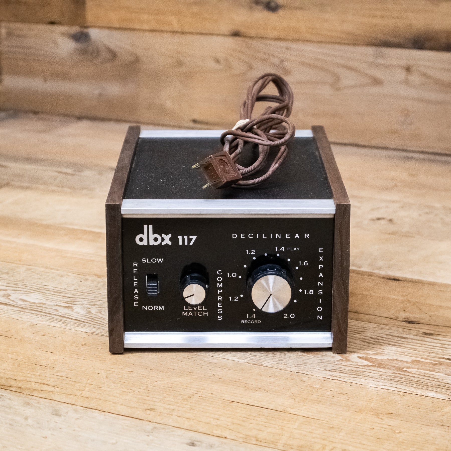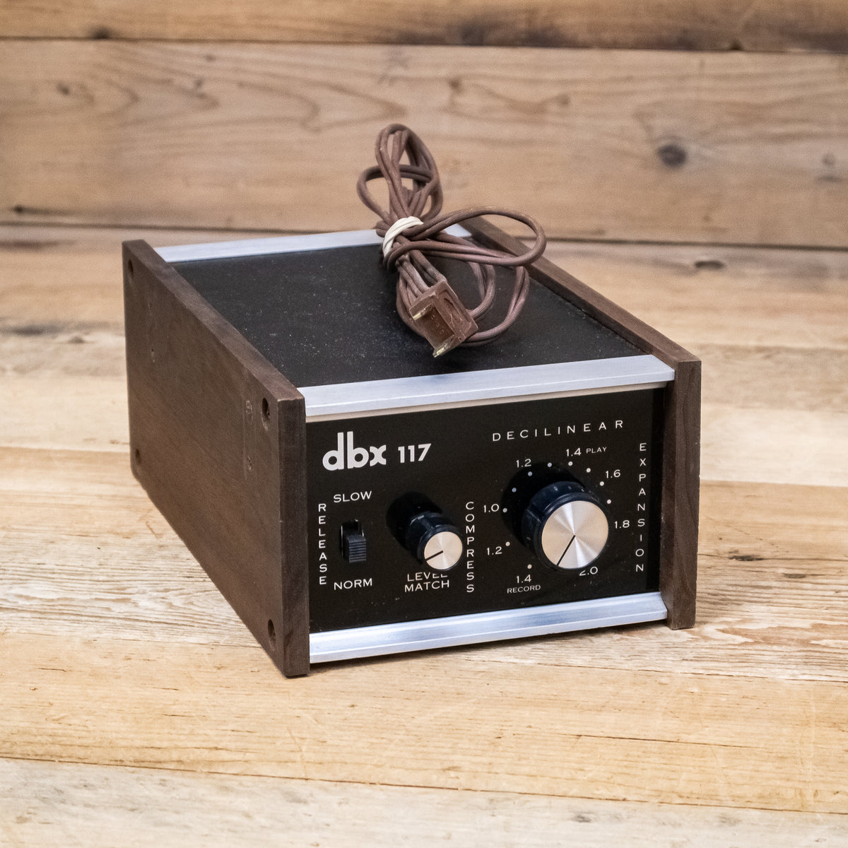 This vintage DBX 117 Compressor has an attached Power Cable.
