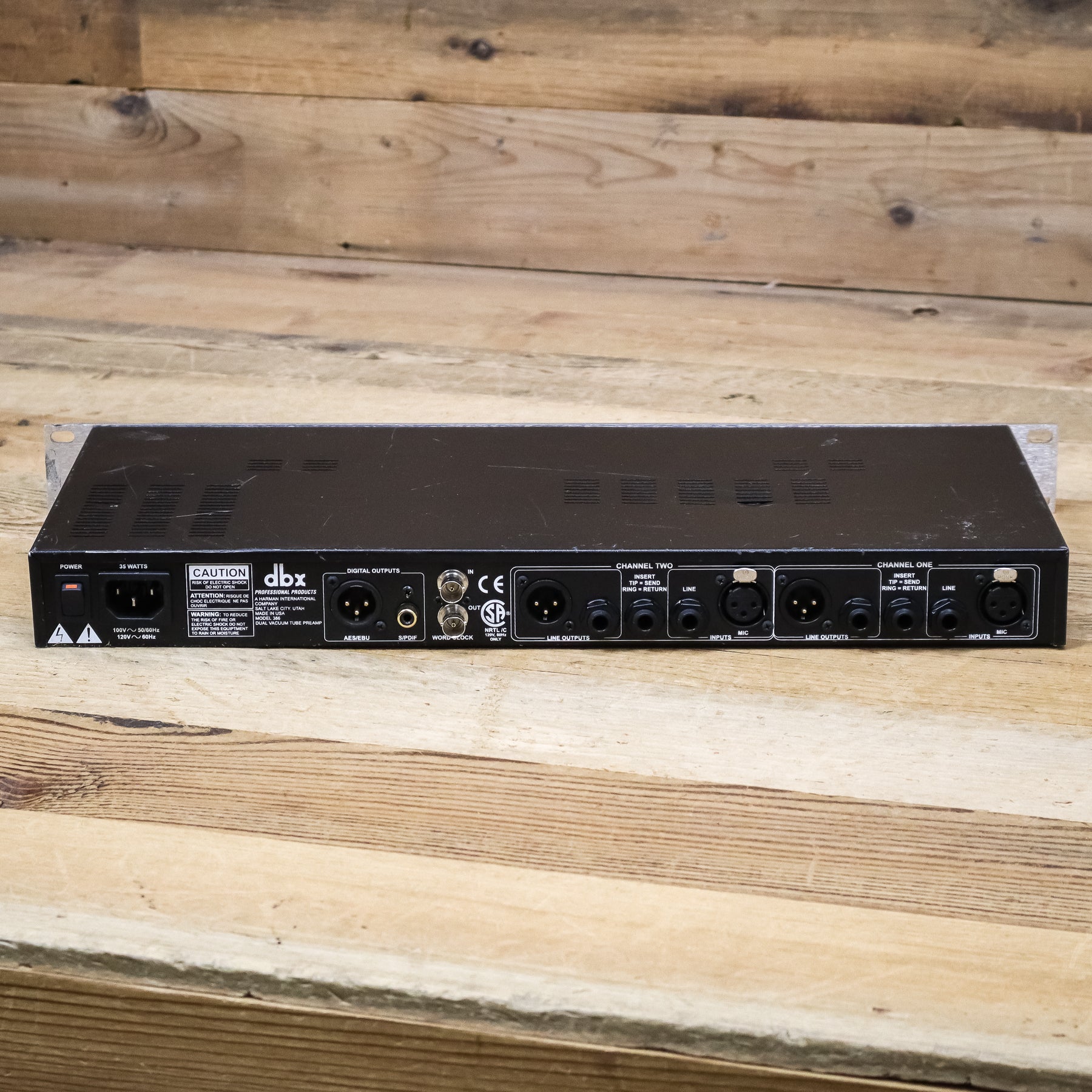 The high impedance, 1/4" instrument input located on the front panel, as well as the mic/line switch, and 20 dB pad show our dedication to providing convenience in the studio. The 12 segment LED meters provide a visual indication of analog or digital levels at a glance. The rear panel includes both mic and line inputs and outputs, word clock sync input and output, and digital outputs. Add selectable sampling rates of 44.1 kHz, 48 kHz, 88.2 kHz, or 96 kHz; selectable dithering and noise shaping; and separate analog and digital output controls to this already impressive list of features, and we think you'll agree that the 386 lives up to the innovative dbx standards.