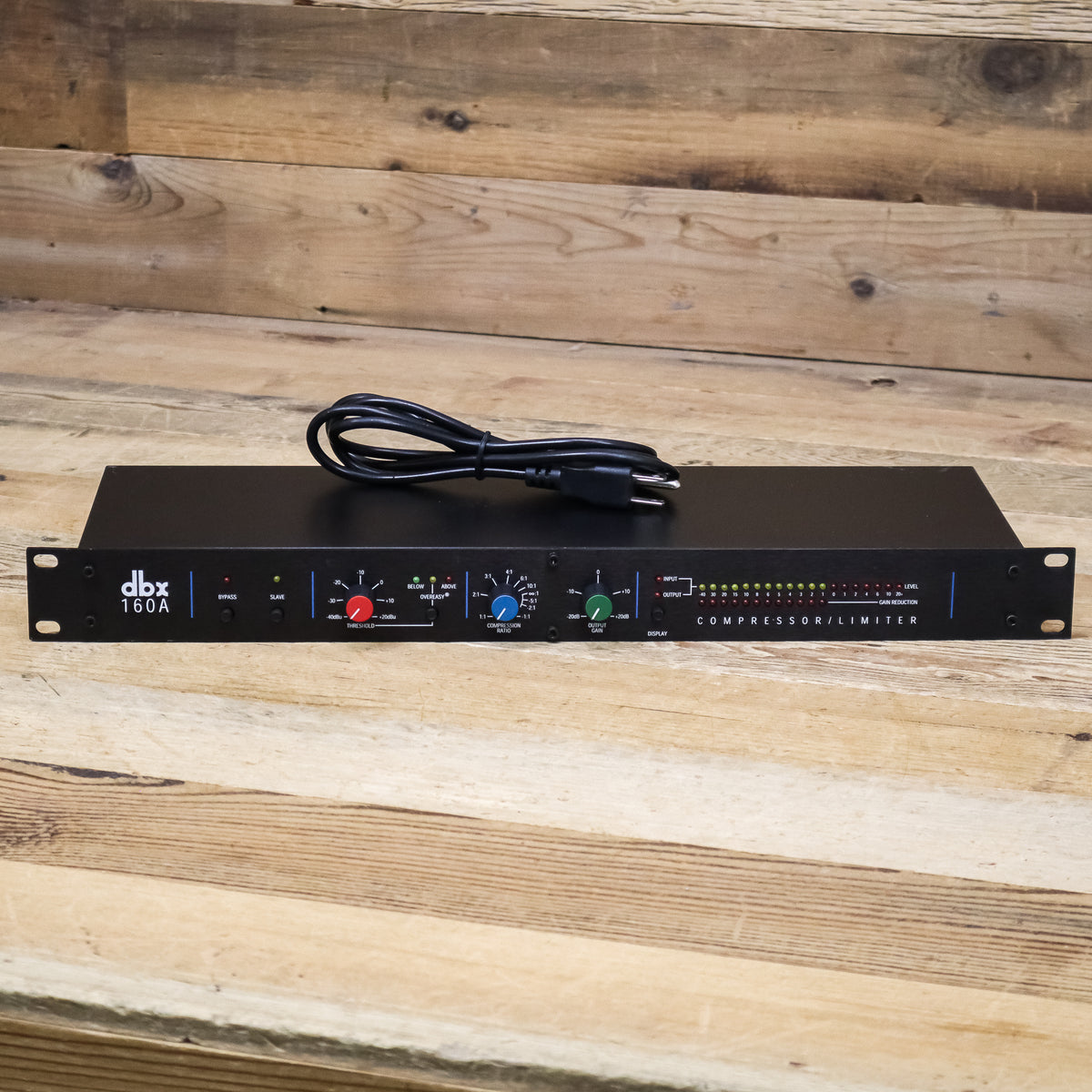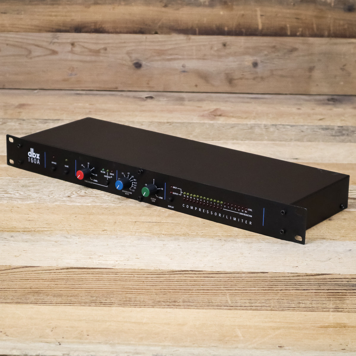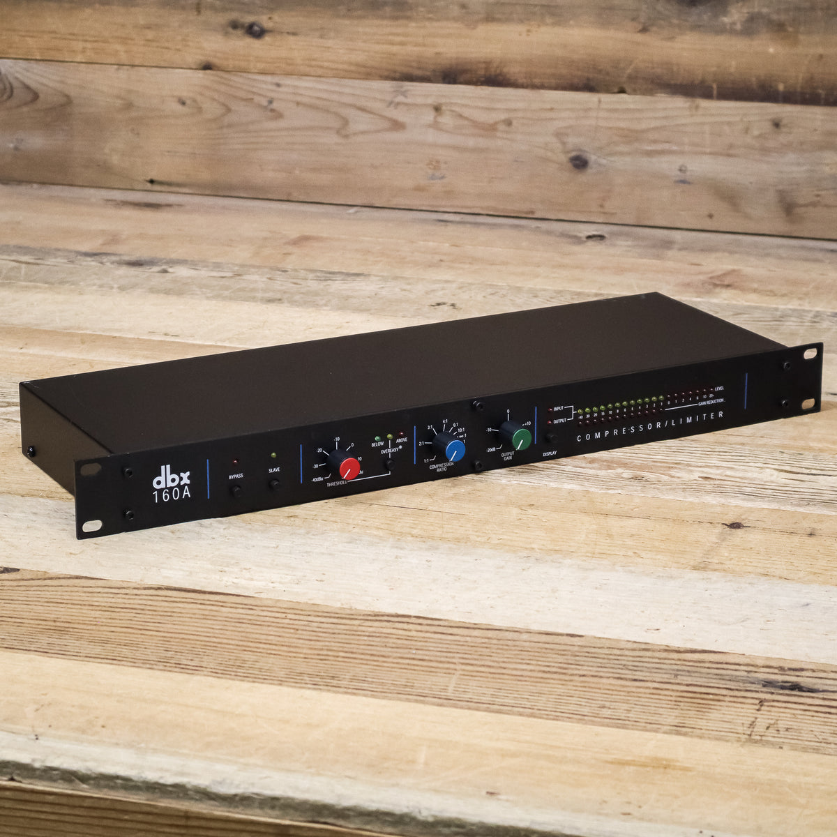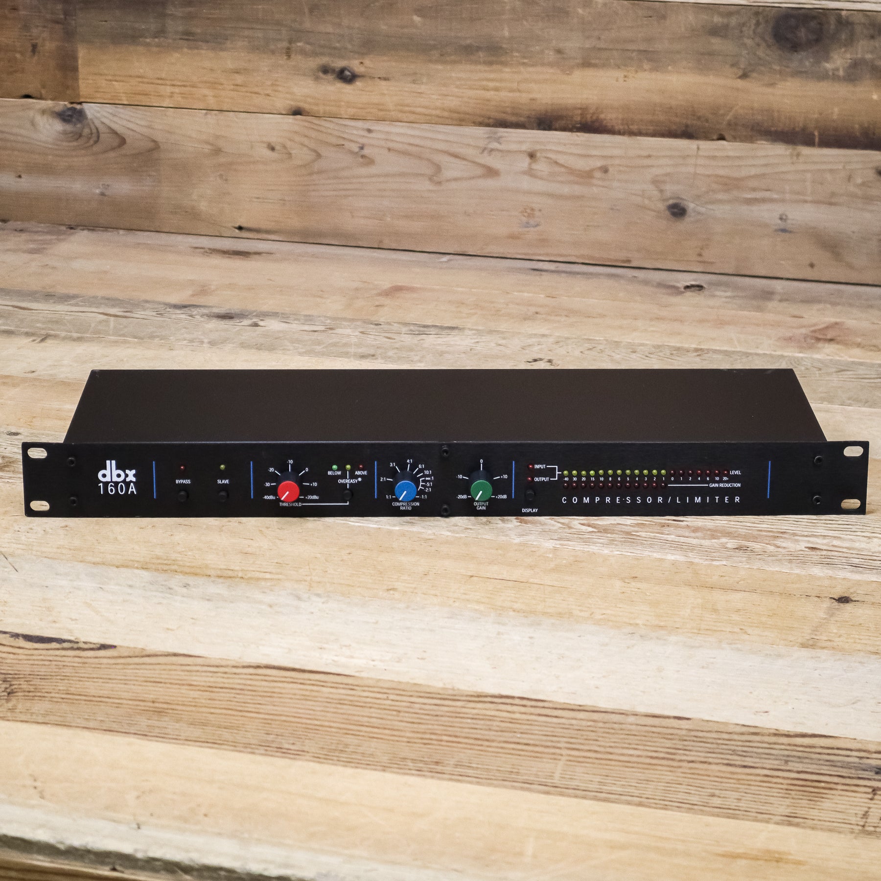 Featuring switch-selectable OverEasy and Hard Knee compression curves along with extremely wide-ranging threshold, ratio and output controls, the dbx 160A is up to any task. True RMS level detection provides the most natural-sounding dynamics processing available, from subtle compression to "brick wall" peak limiting. Choose low ratios and OverEasy compression to transparently smooth out fluctuating vocal and instrumental levels. Or use the 160A's Hard Knee compression and high ratios (up to and beyond :1 and over 60dB gain reduction) for bombproof protection against overload distortion in digital recording, P.A. systems and broadcast signals. The 160A is fully compatible with +4/-10dB and balanced/ unbalanced systems, and its electronically balanced output stage is an outstanding line driver for long cable runs (an output transformer is optional). The 19-segment, switchable input/ output LED metering can be easily calibrated to any operating level. 12-segment gain reduction LEDs provide precise analysis at a glance.