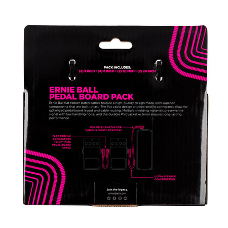 Ernie Ball flat ribbon patch cables feature a high-quality design made with superior components that are built to last. The flat cable design and low-profile connectors allow for optimized pedalboard layout and cable routing. Multiple shielding materials preserve the signal with low handling noise, and the durable PVC jacket exterior ensures long-lasting performance.