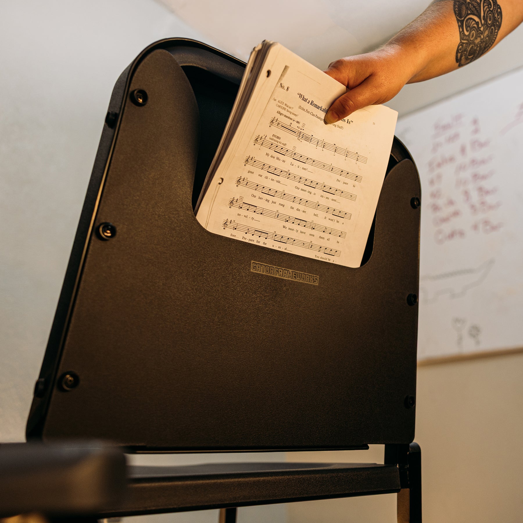 Designed with musicians in mind, the Frameworks Performing Arts Chair offers exceptional comfort and support for long rehearsals and performances. Its 97-degree "band-pitch style" seat-to-backrest angle promotes optimal breathing posture, allowing musicians to perform at their best. Built for durability, this chair features a 7/8", 16-gauge square tubing frame and a 14-gauge rear seat brace, ensuring long-lasting strength and stability. A built-in sheet music storage compartment on the back of the chair provides a convenient place to keep essential materials within reach. Perfect for performance spaces, this chair is stackable up to 18 chairs high on chair carts, making it an efficient, space-saving solution. Protective bumpers help prevent damage to the black powder-coated finish, maintaining a sleek and professional look over time. Additionally, polyethylene floor glides safeguard floors from scratches, making it ideal for various venues. Whether in a school, concert hall, or rehearsal space, the Frameworks Performing Arts Chair is a reliable, ergonomic choice for musicians..