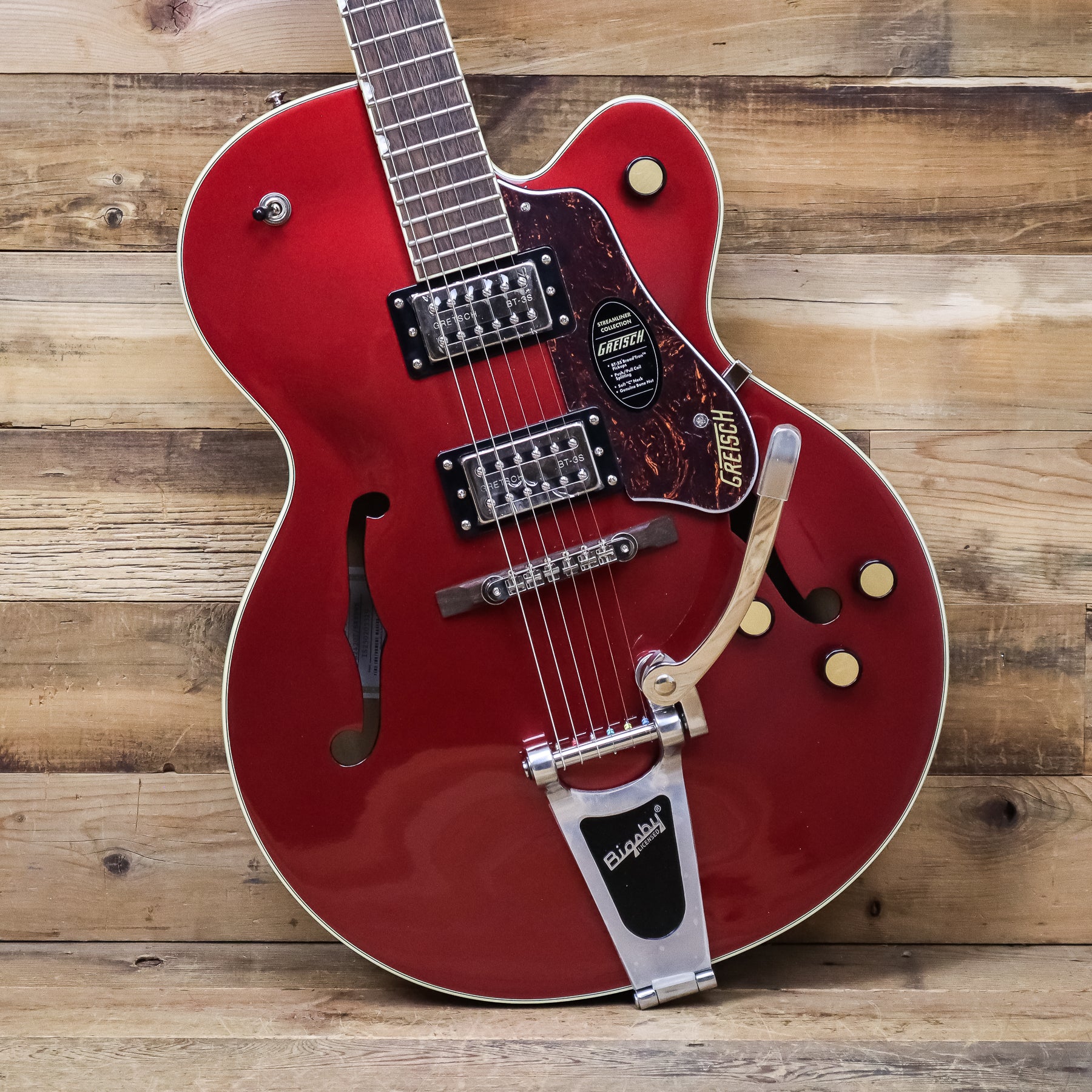 This brand new Gretsch G2420T Streamliner Hollow Body with Bigsby, Broad'Tron BT-3S Pickups comes in a Brandywine finish.