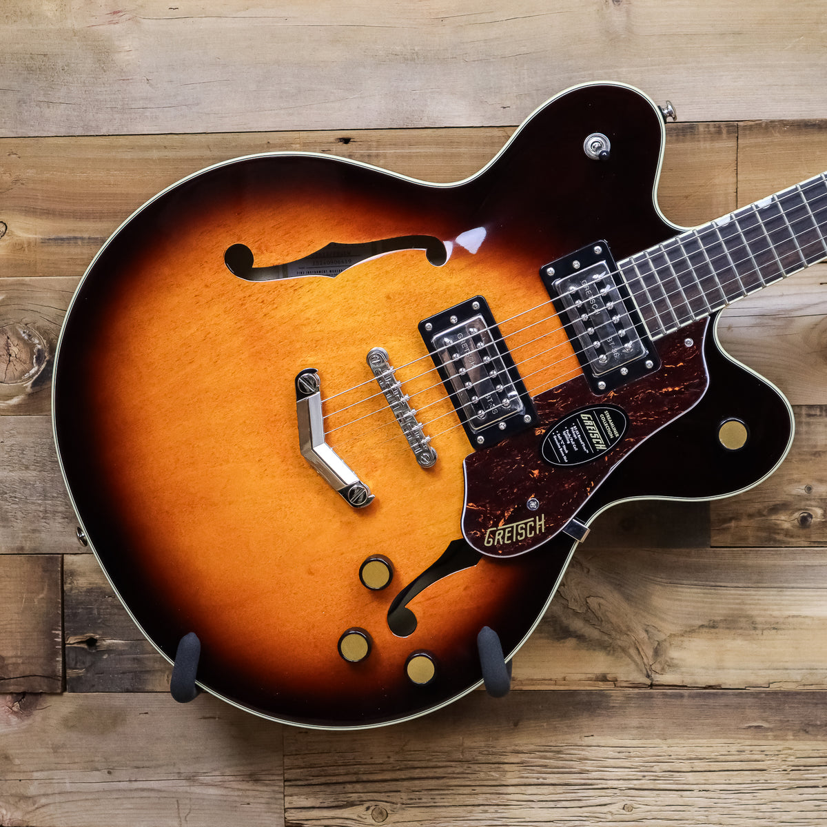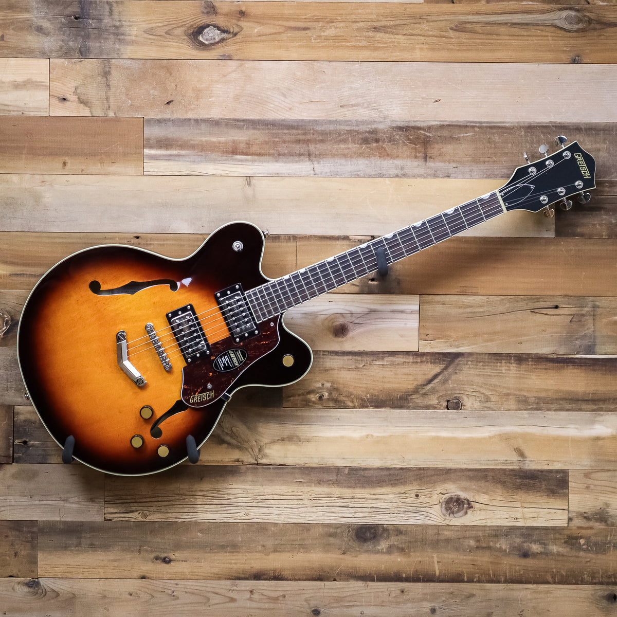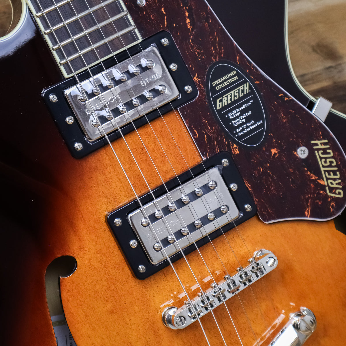 This brand new Gretsch G2622 Streamliner Center Block with V-Stoptail features Broad’Tron BT-3S Pickups and comes in a Forge Glow finish.