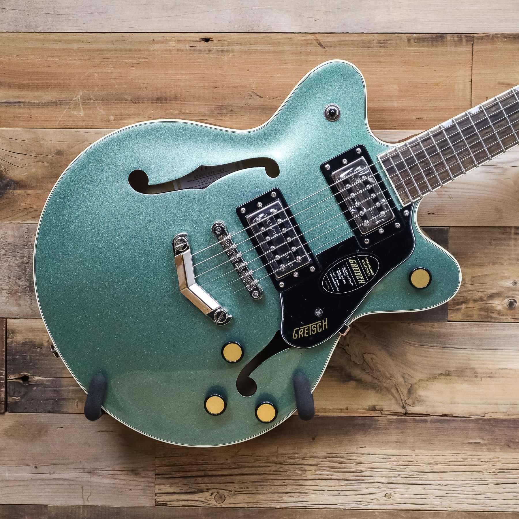 The G2655 Streamliner Center Block Jr. with V-Stoptail bursts into the modern era with powerful sound and style in a smaller package. The sleek G2655 is designed for the guitarist who demands more than the mundane from an instrument - more performance, more style and most importantly, more volume - while retaining everything you expect from a Gretsch.