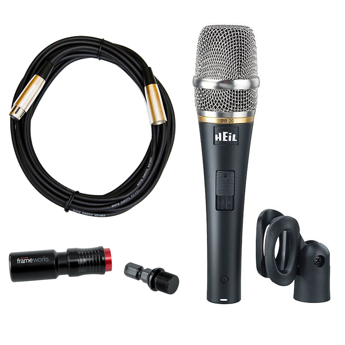 This bundle includes the Heil PR 20 SUT Utility Dynamic Handheld Microphone with On/Off Switch, a Gator Frameworks GFW-MIC-QRTOP Quick Release Microphone Attachment, and a Professional 20-foot XLR Microphone Cable.