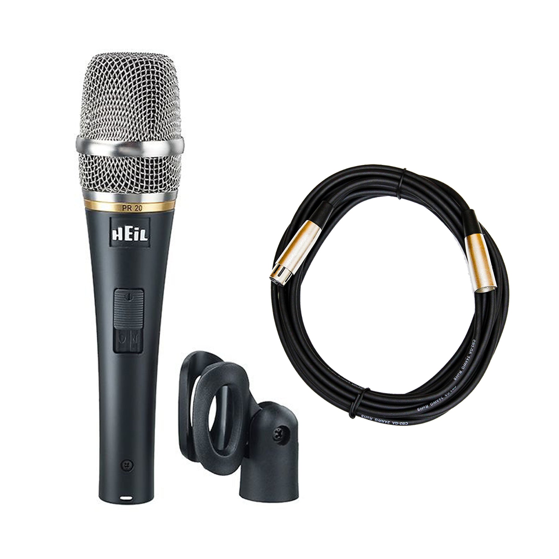 This bundle includes the Heil PR 20 SUT Utility Dynamic Handheld Microphone with On/Off Switch and a Professional 20-foot XLR Microphone Cable.