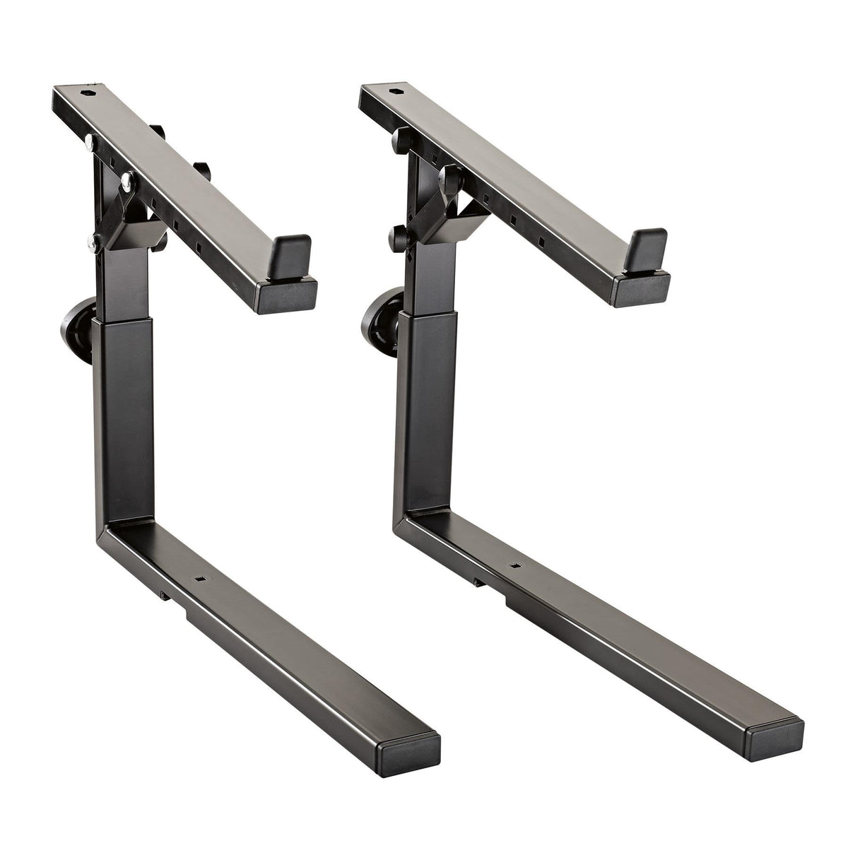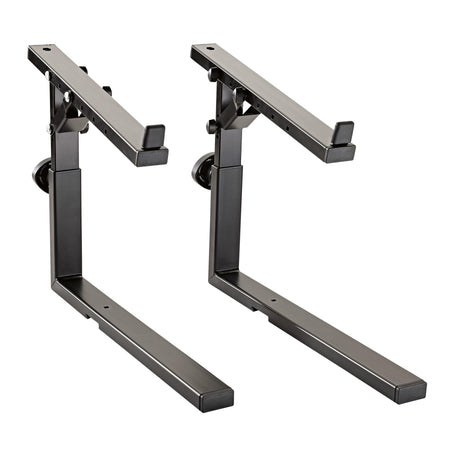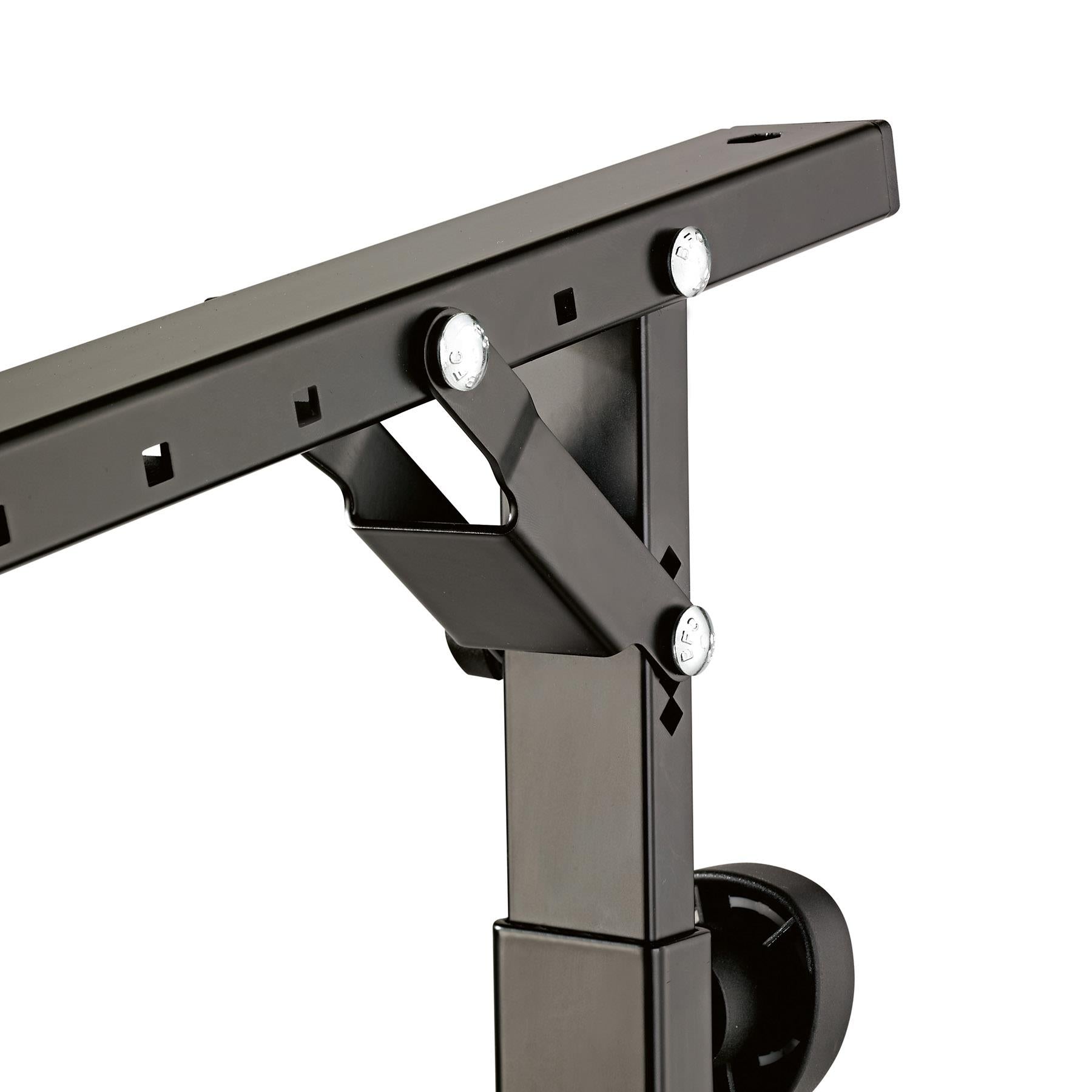 The ideal extension to the Omega 18810 keyboard table for a second keyboard or a laptop. The large lower extension arms can even support the largest master keyboards. The upper extension arms can now also be adjusted down by 4 positions providing an unobstructed view of the lower keyboard. The height of the stacker can be adjusted as desired quickly and easily using a ratchet-lock. Thanks to a choice of 10 different heights, everyone will find their personal setting. In addition, the upper extension arms can be adjusted over 5 steps from 0° (horizontal) to 20° for further optimization of playing position. Self-adhesive rubber pads prevent scratches or slipping of instruments.