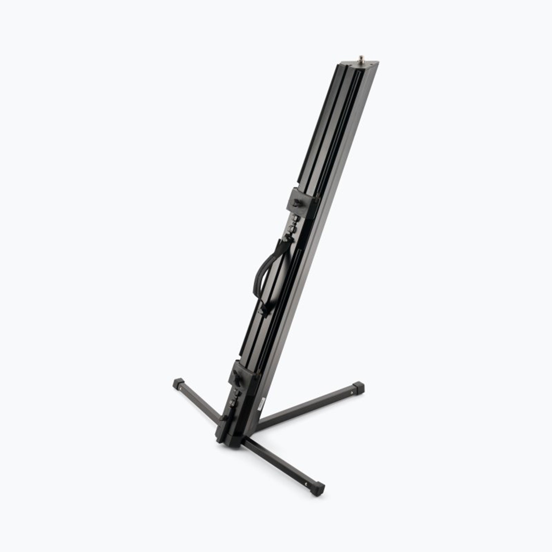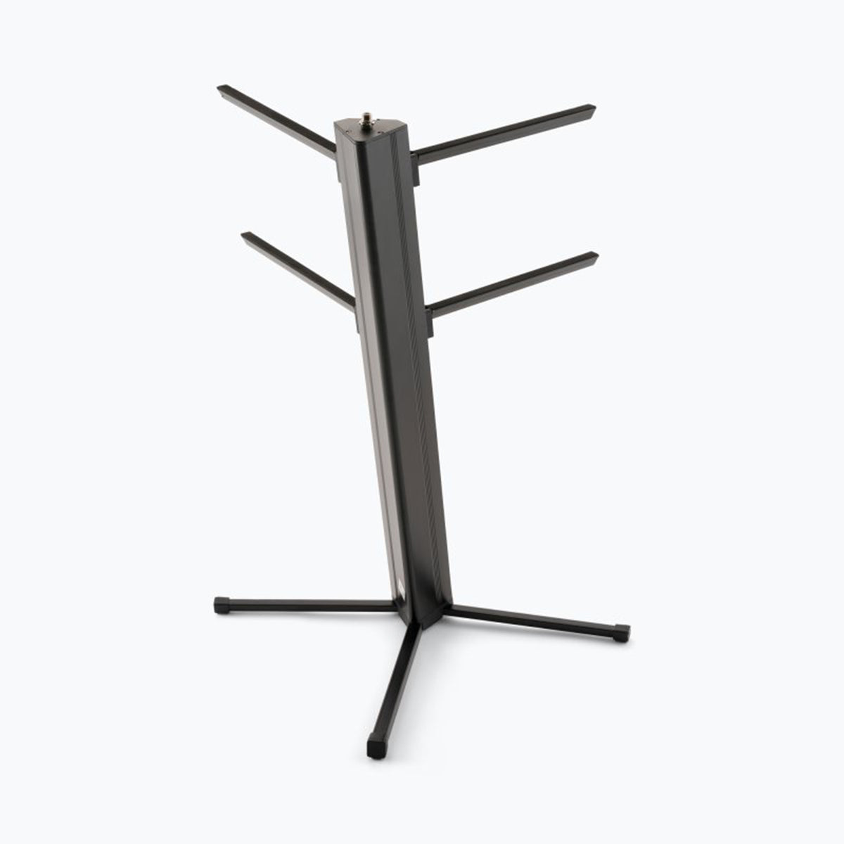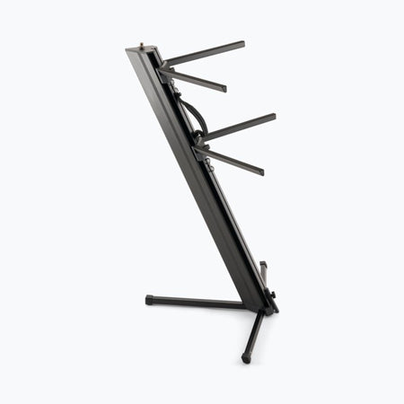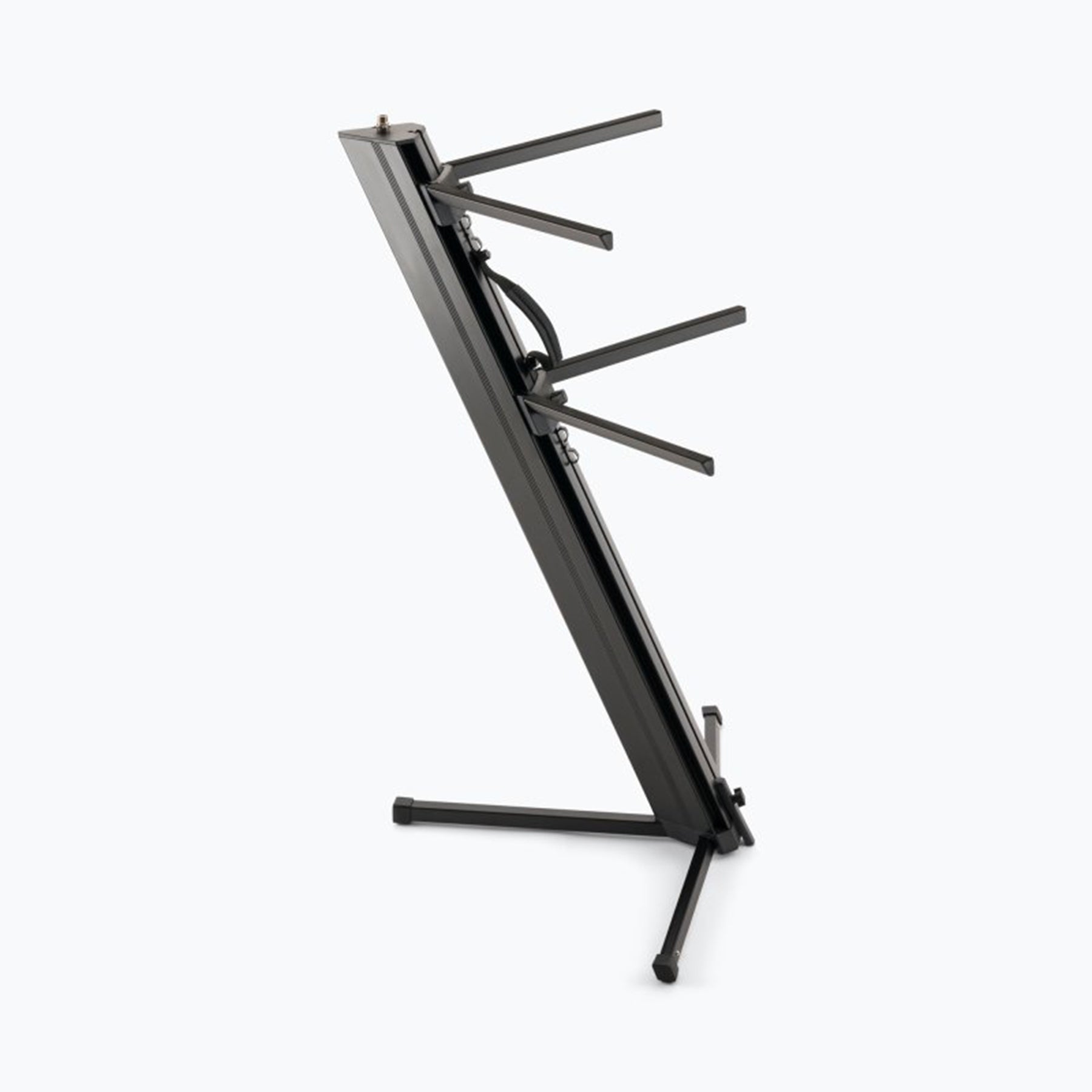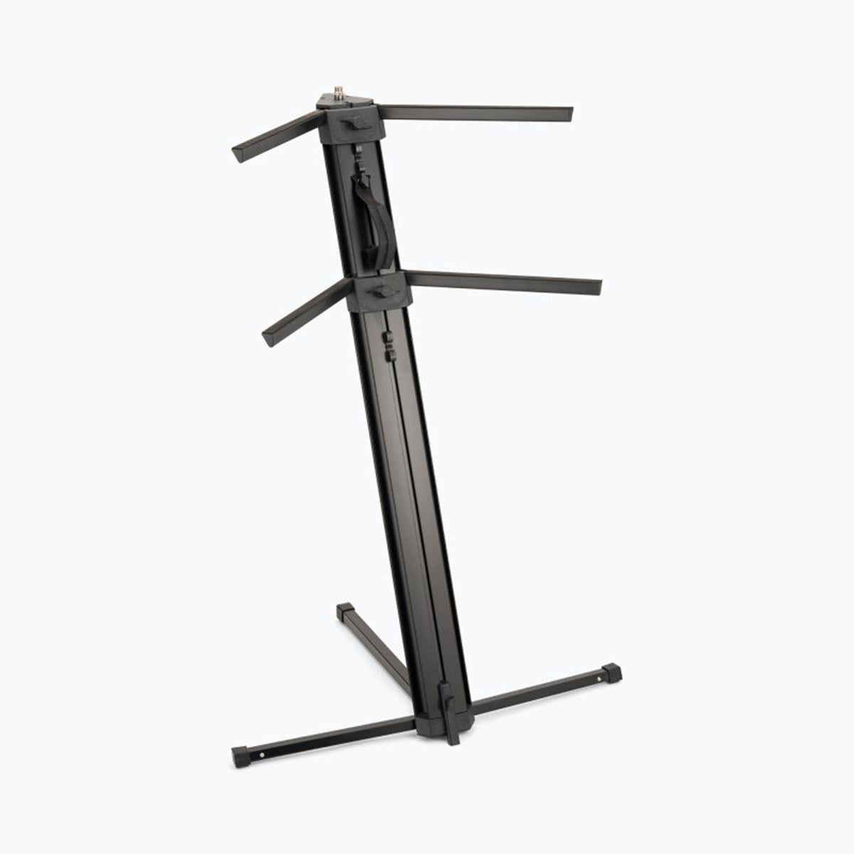 Our KS9102 Quantum Core Column Keyboard Stand provides a wide, stable base and slip-free support for two medium-format keyboards and a mic. This sturdy stand features two independent height-adjustable tiers for ergonomic playing and integrated cable management to help keep your setup organized. A threaded stem at the top of the column mounts mic accessories while eliminating the need for a separate floor stand. The base and support arms fold flat for convenient storage and transportation while a built-in padded handle enables easy carrying.