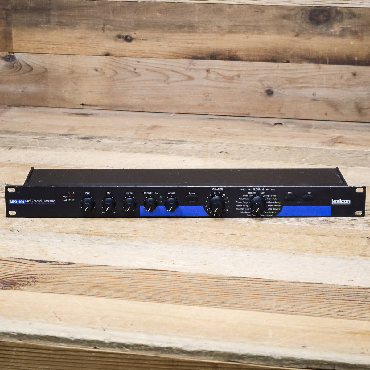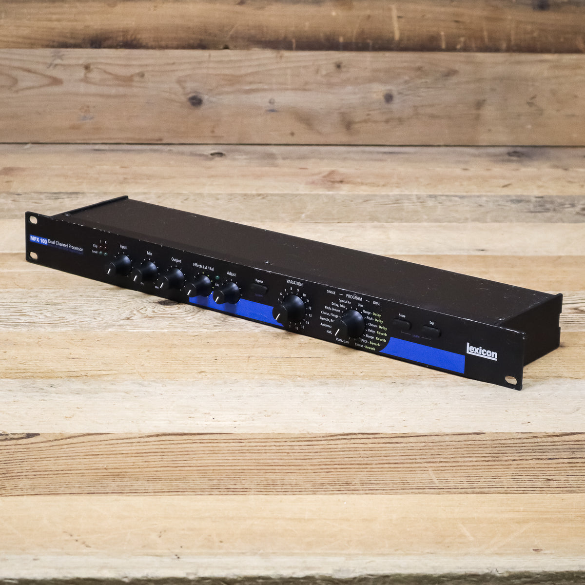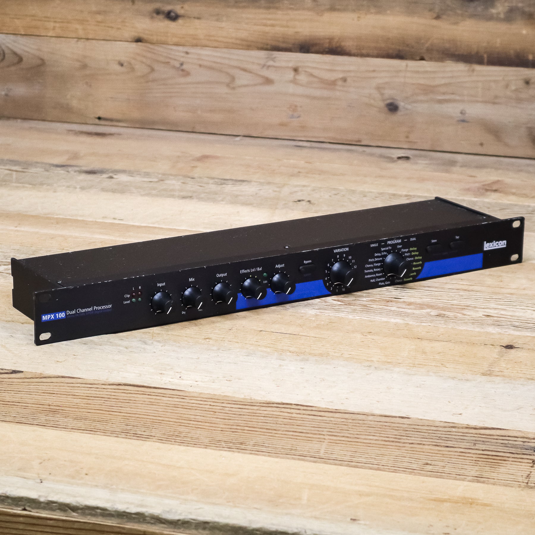 The MPX 100 is a true stereo dual-channel processor with 24-bit internal processing, 20-bit A/D-D/A and S/PDIF digital output for a very affordable price. Utilizing a new version of Lexicon's proprietary Lexichip, the MPX 100 offers 240 presets with classic, true stereo reverb programs such as Ambience, Plate, Chamber and Inverse as well as Tremolo, Rotary, Chorus, Flange, Pitch, Detune, Delay, and Echo. Dual-channel processing allows control of completely independent effects on the left and right channels.