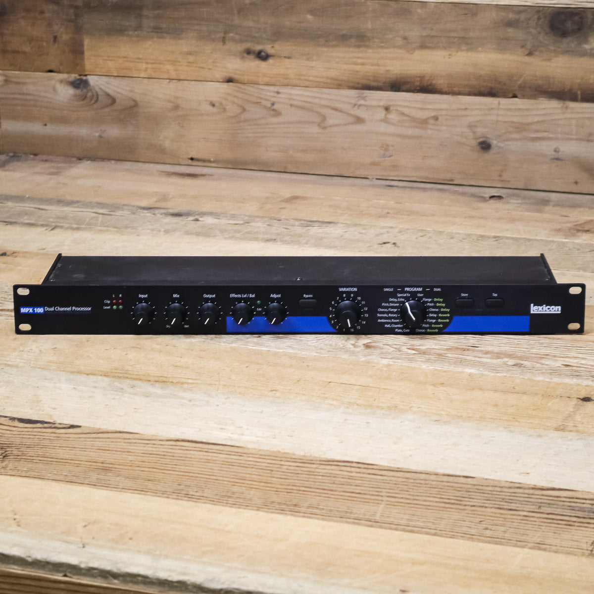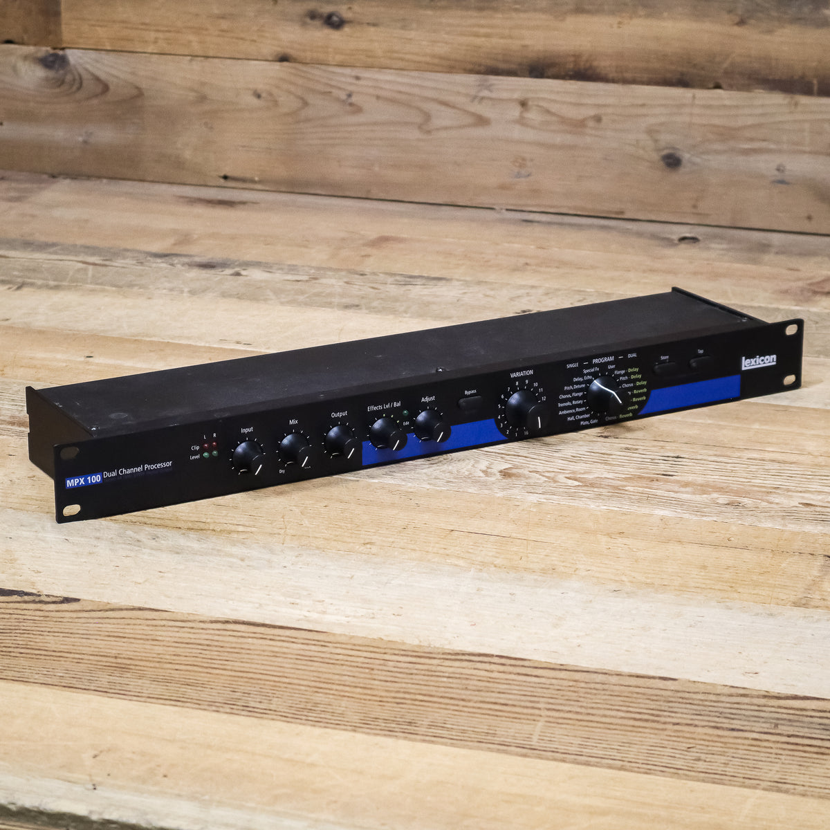 The MPX 100 is a true stereo dual-channel processor with 24-bit internal processing, 20-bit A/D-D/A and S/PDIF digital output for a very affordable price. Utilizing a new version of Lexicon's proprietary Lexichip, the MPX 100 offers 240 presets with classic, true stereo reverb programs such as Ambience, Plate, Chamber and Inverse as well as Tremolo, Rotary, Chorus, Flange, Pitch, Detune, Delay, and Echo. Dual-channel processing allows control of completely independent effects on the left and right channels.