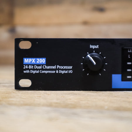 The MPX 200 offers a full range of MIDI controls such as Program Change, MIDI bulk dump, and an easy Learn mode that allows MIDI patching of up to 5 front panel controls. Other features include 3-stage headroom indicators, 4-stage compression indicators, a headphone output, a software selectable MIDI Out/Thru port, cue program mode, and pushbutton or footswitch selection of dry or muted audio output.