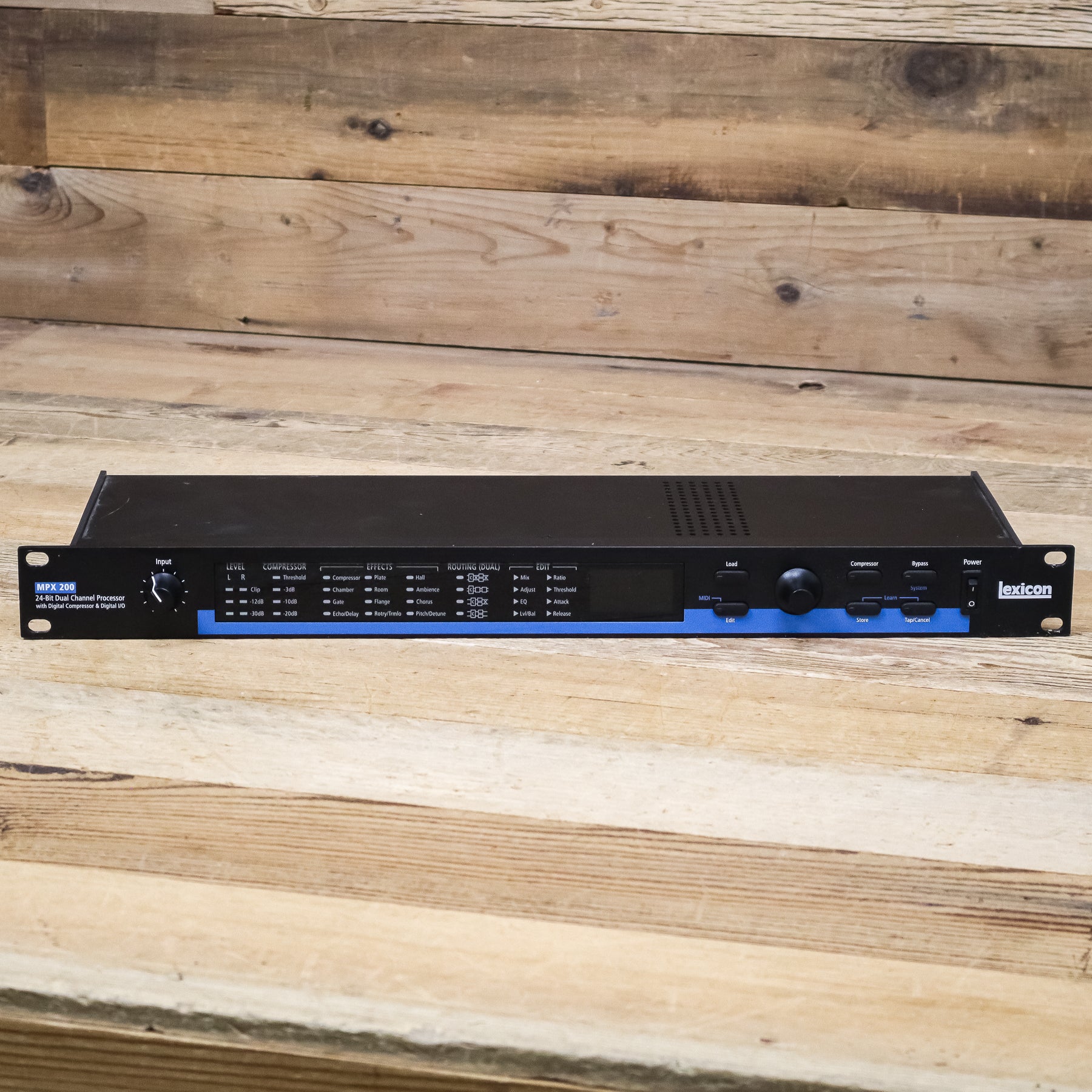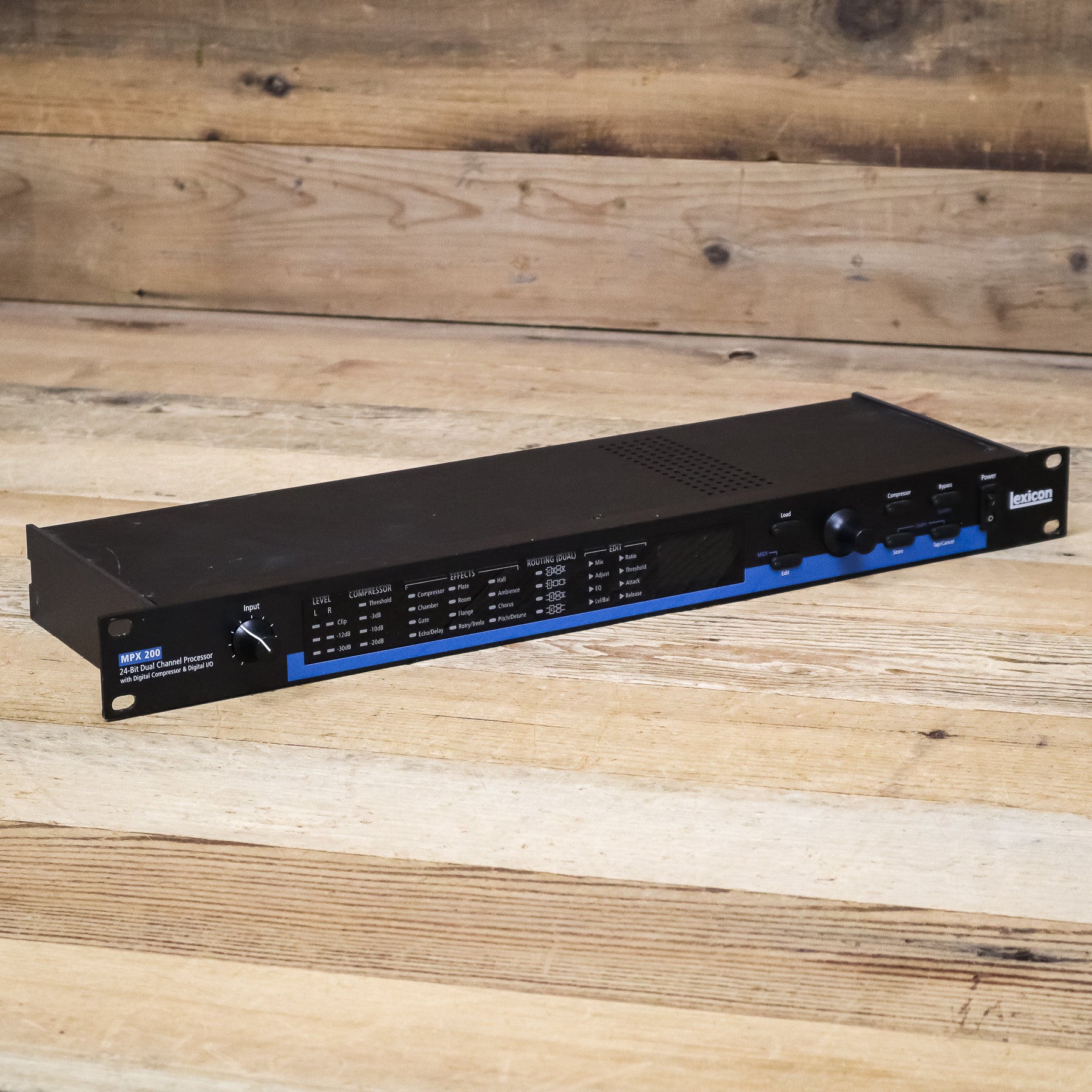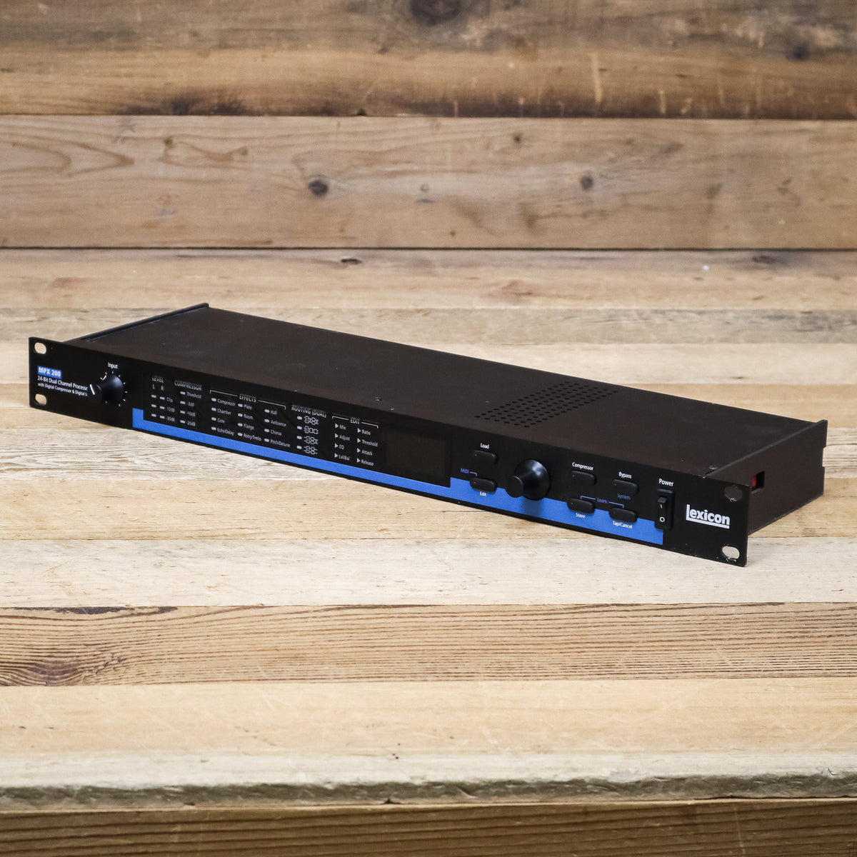 The MPX 200 is a true stereo, dual-channel processor. It combines the best of the MPX 100 with several new features providing an advanced level of operation. It includes 24-bit internal processing, S/PDIF input and output, and Lexicon's exclusive Lexichip engine. Add to this 24-bit A/D-D/A, a new digital compressor, extensive front panel parameter LEDs, internal power supply, and an expanded User Bank capable of storing 64 user programs. It offers 240 presets with classic Lexicon reverb, as well as Chorus, up to 5.5 second Delay, Detune, Echo, Flange, Pitch, Rotary, and Tremolo. Dual channel processing provides 2 independent effects in an assortment of configurations including Cascade, Dual Mono, Dual Stereo, and Mono Split. The digital compressor is available in all 240 presets, simultaneously providing up to 2 effects and compression.