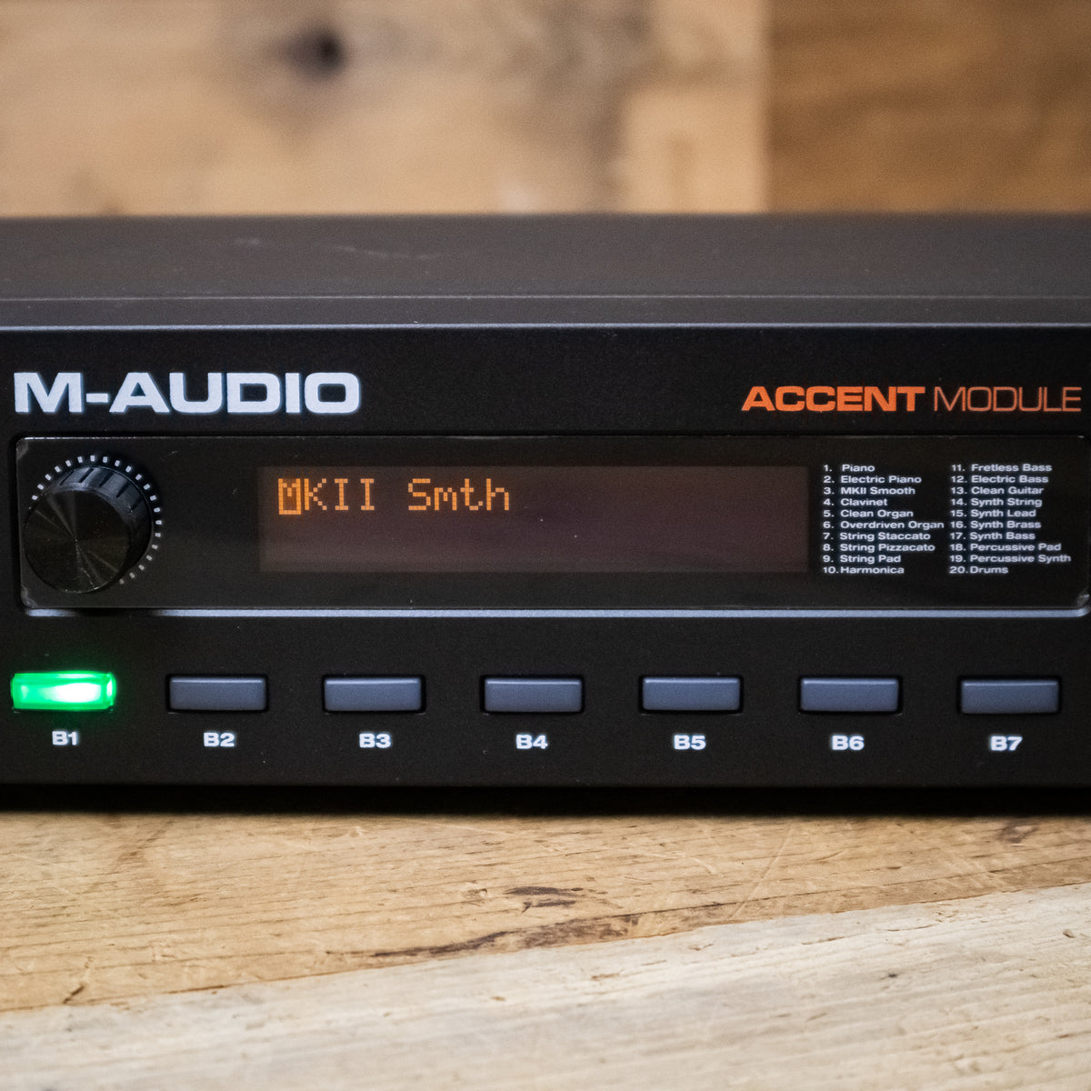 When players want to convert their standalone MIDI controller into a stage piano, free from the restrictive encumbrance of a laptop computer, the M-Audio Accent Module is the perfect solution. This compact unit easily connects to any USB or 5-pin MIDI controller. With 20 built-in voices, it has the ability to split or layer two voices simultaneously.