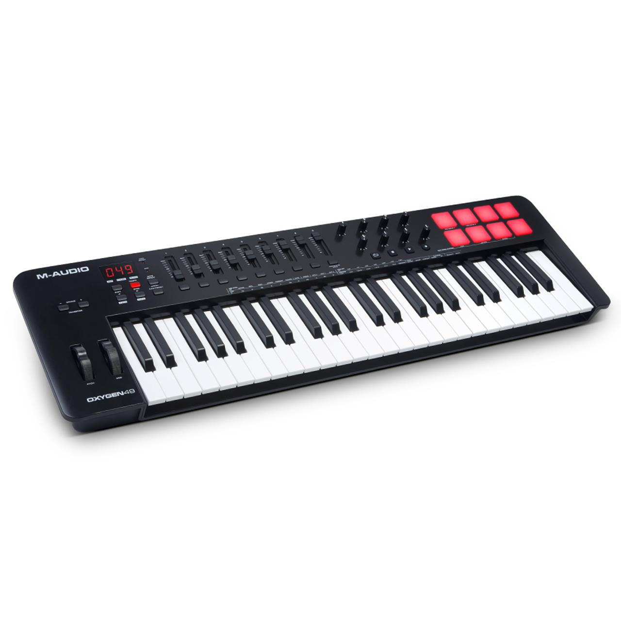 The Oxygen 49 (MKV) controller includes powerful features essential for creating and producing music such as Note Repeat (a staple mark in beat production), Full Velocity Control of keys and 8 pads, 8 assignable knobs for controlling effect plugins and virtual instruments, and 9 assignable faders for mixing: all opening a world of precise music creation techniques making your signature sound professional and modern.