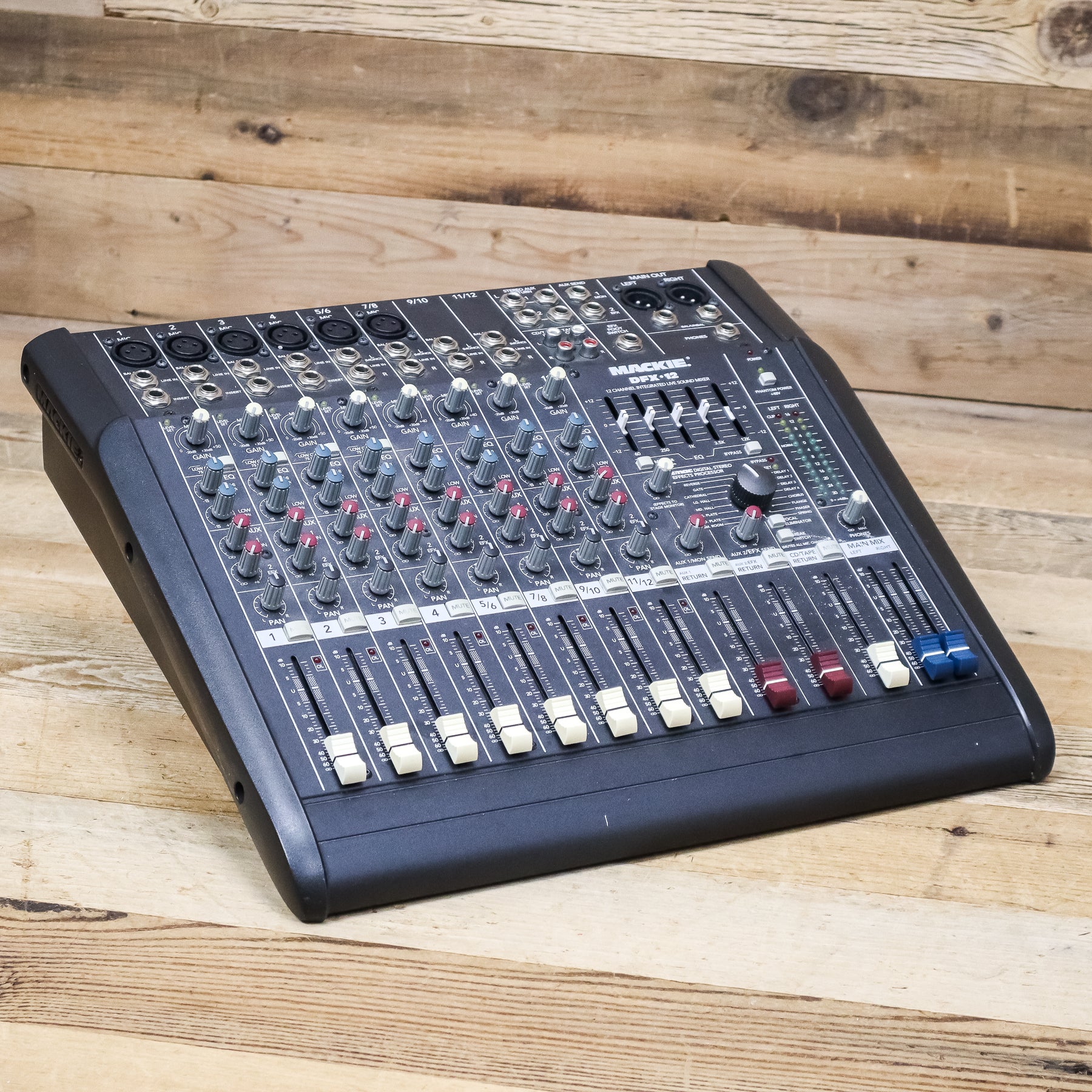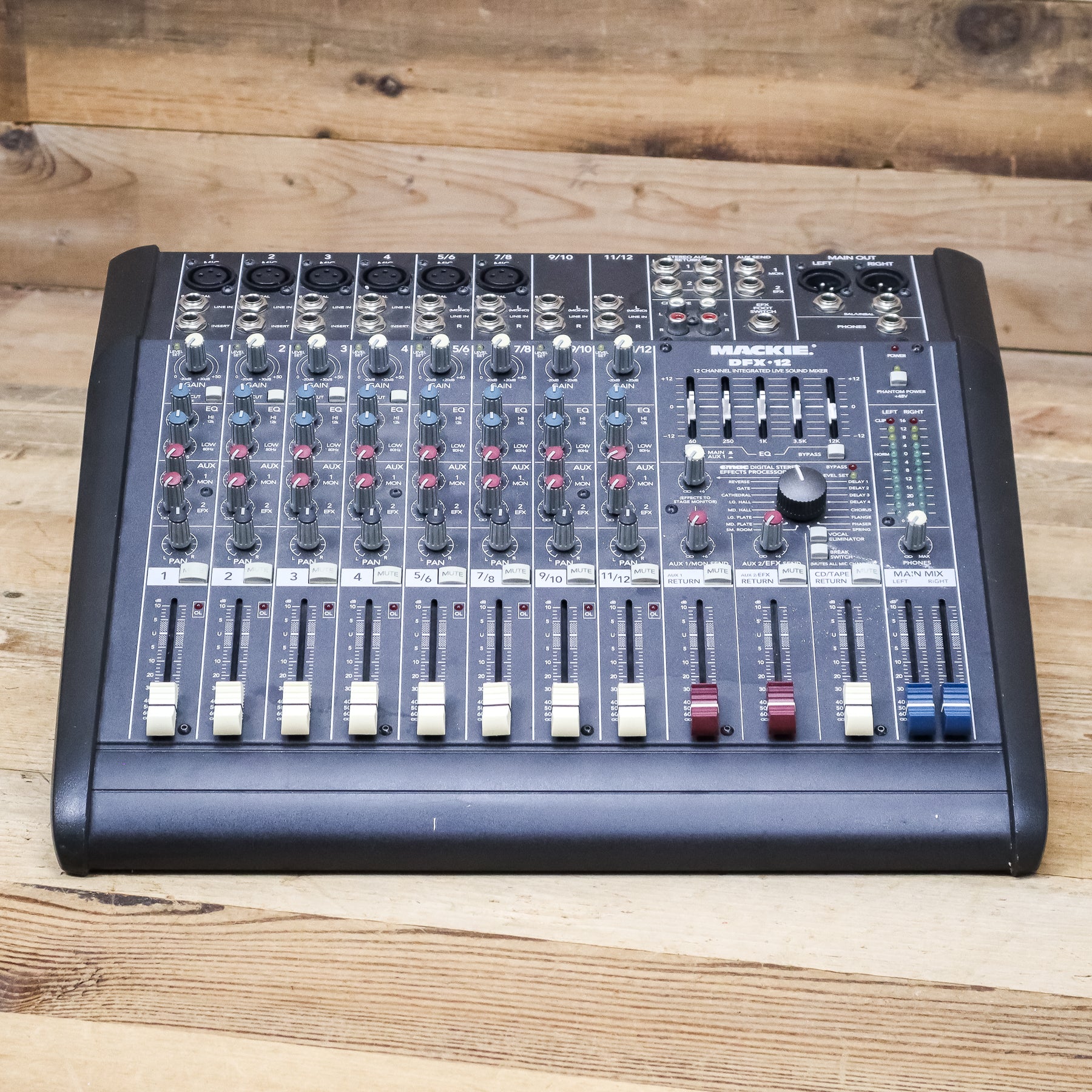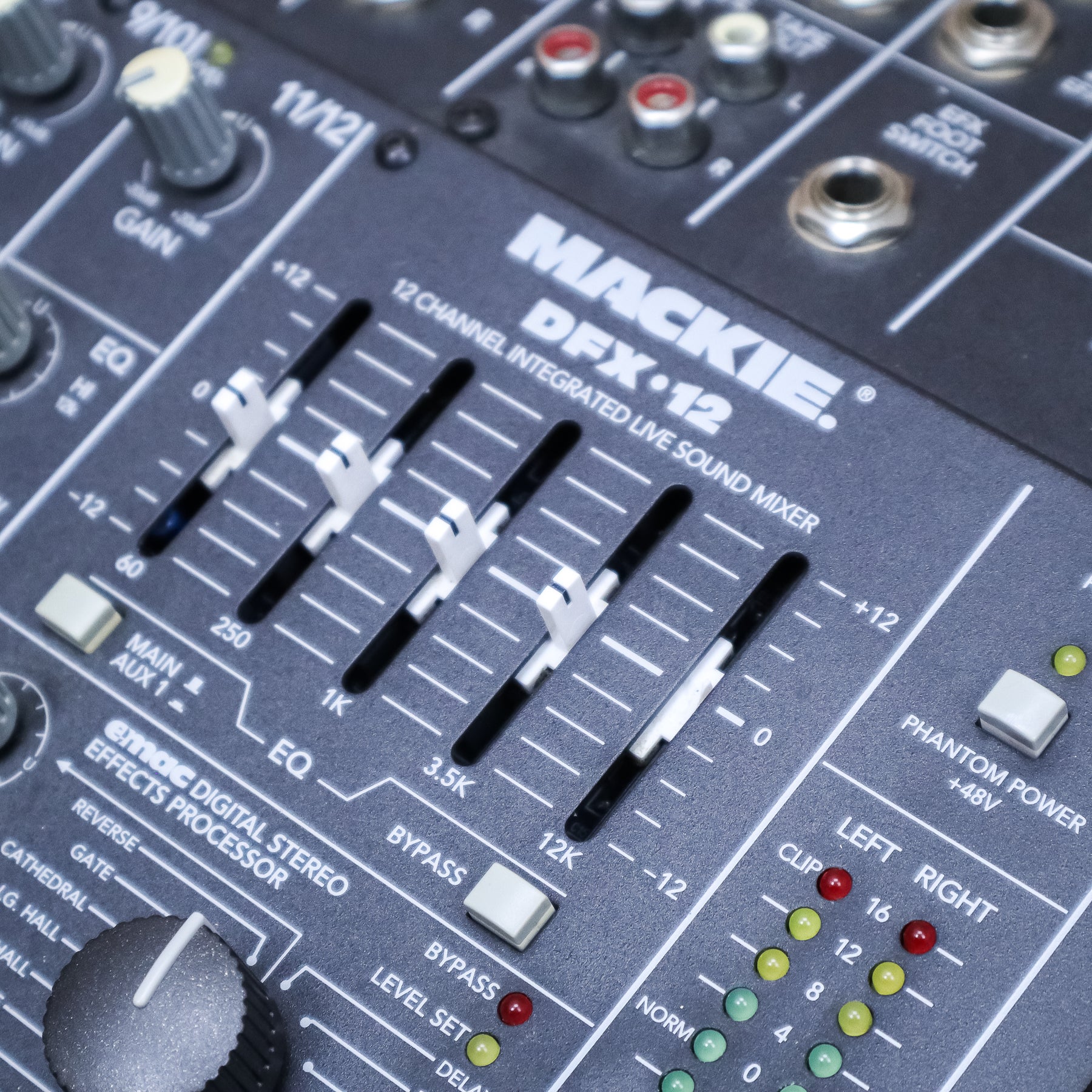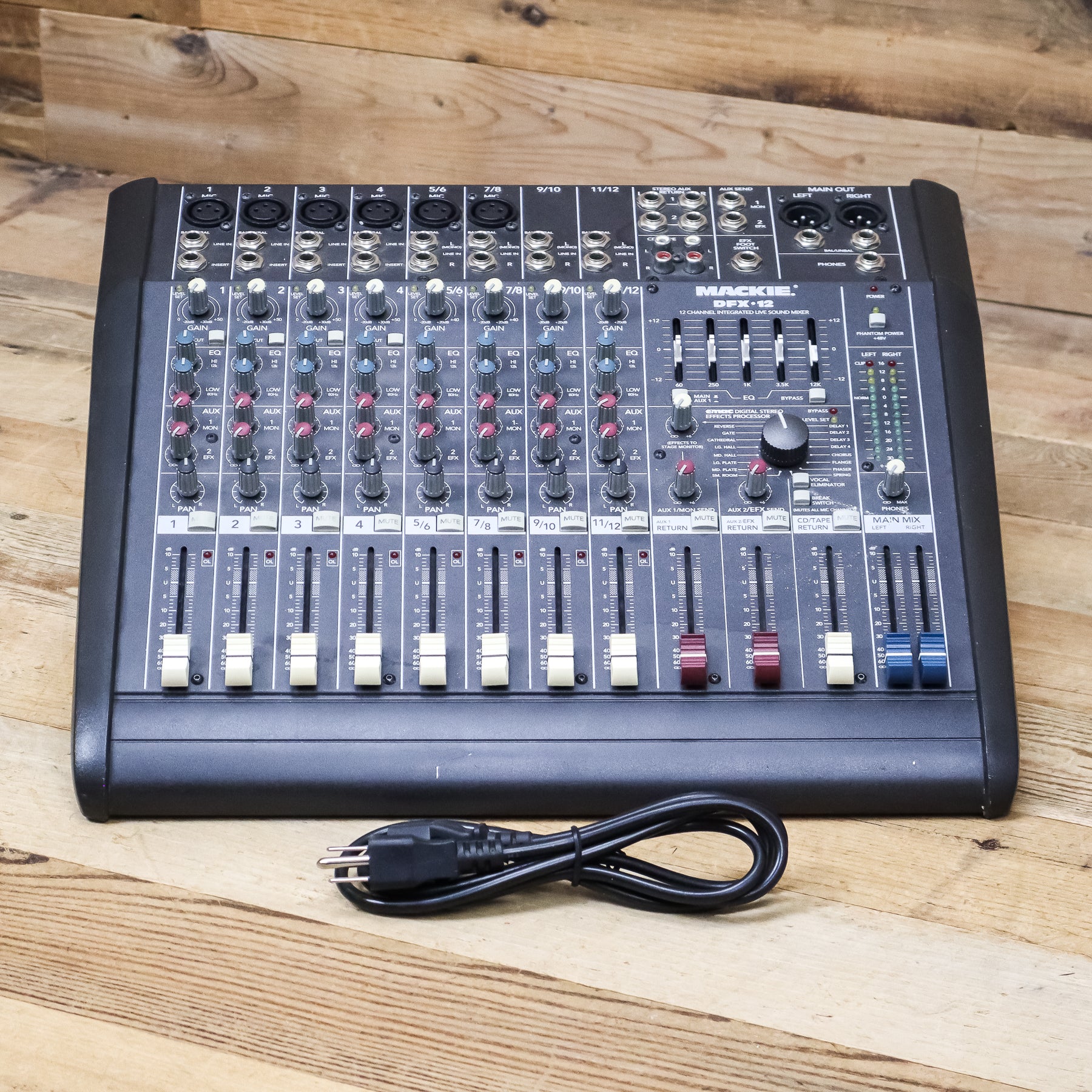 The Mackie DFX12 12x2 Mixer with EFX is a killer audio mixer for many applications. It offers 12 input channels (4 mono mic/line, 2 mono mic/stereo line, and 2 stereo/mono line); low-noise, high-headroom mic preamps with +50dB gain range and switchable phantom power on channels 1 & 2; 32-bit EMAC digital EFX processor with 16 effects; 5-band stereo graphic equalizer with 12dB boost/cut; 2-band channel strip shelving EQ; 75Hz low-cut filters and inserts on channels 1 & 2; tape and CD inputs and Tape output; vocal eliminator; break switch for playing music between sets; and lots more.
