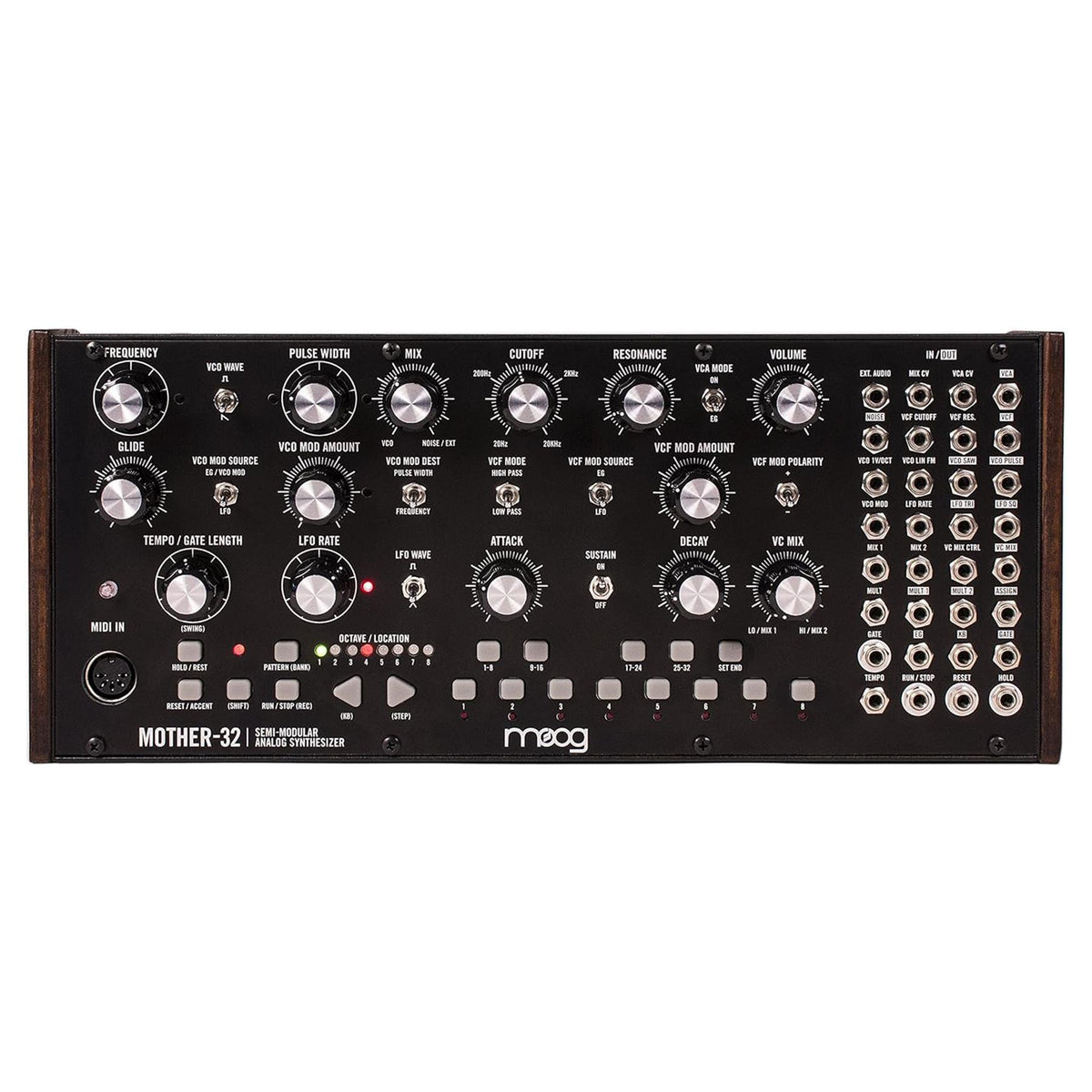 The Mother-32 is secured in an extruded aluminum enclosure with wood sides, but can also easily be relocated to almost any Eurorack enclosure.