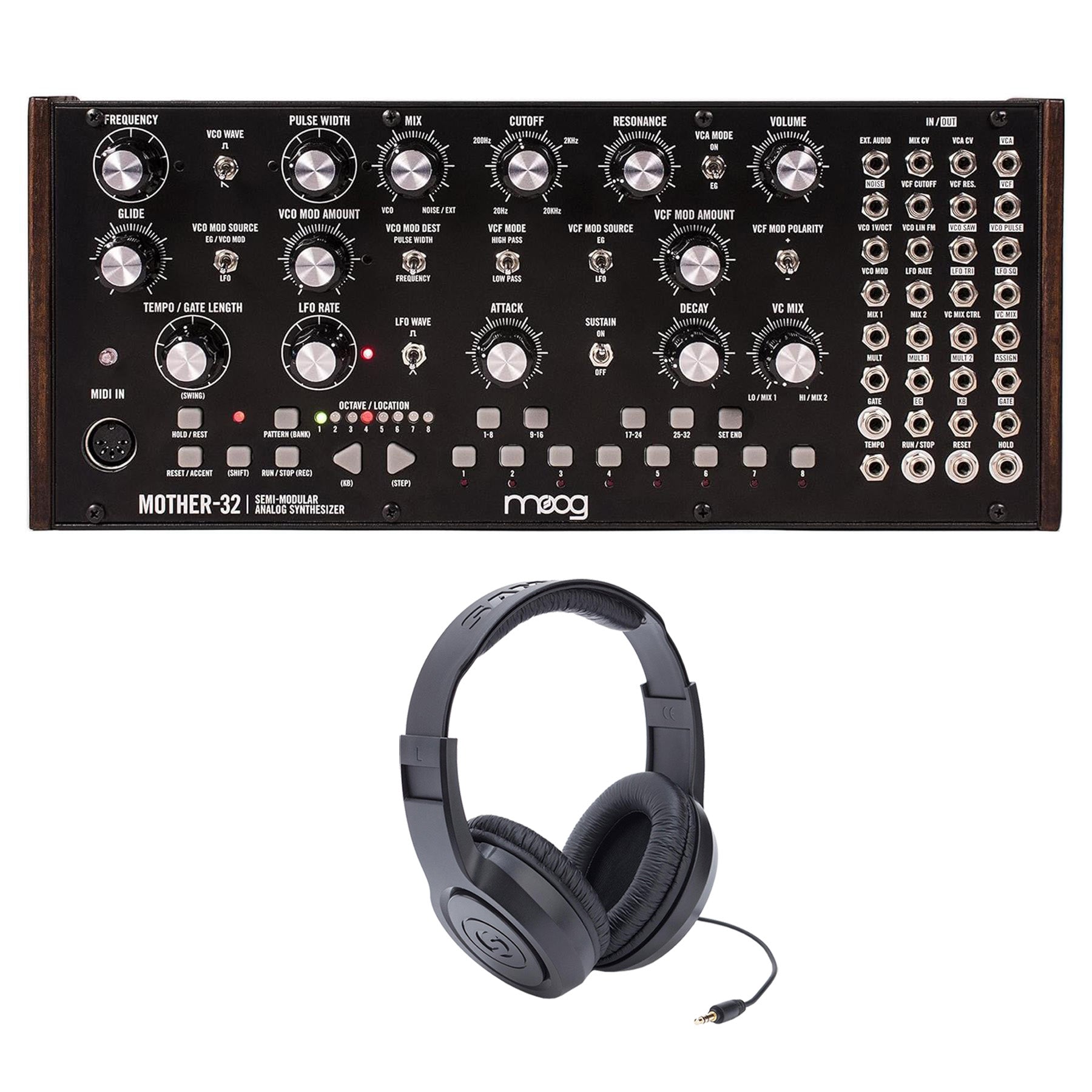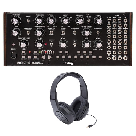 This bundle includes the Moog Mother-32 and a set of Samson SR350 Over-Ear Closed Back Stereo Headphones.
