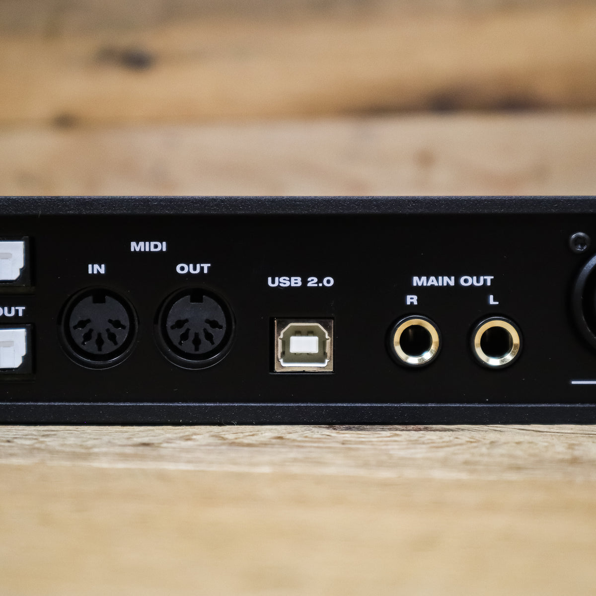 - Separate TRS main outs and front-panel headphone jack, each with independent volume control.