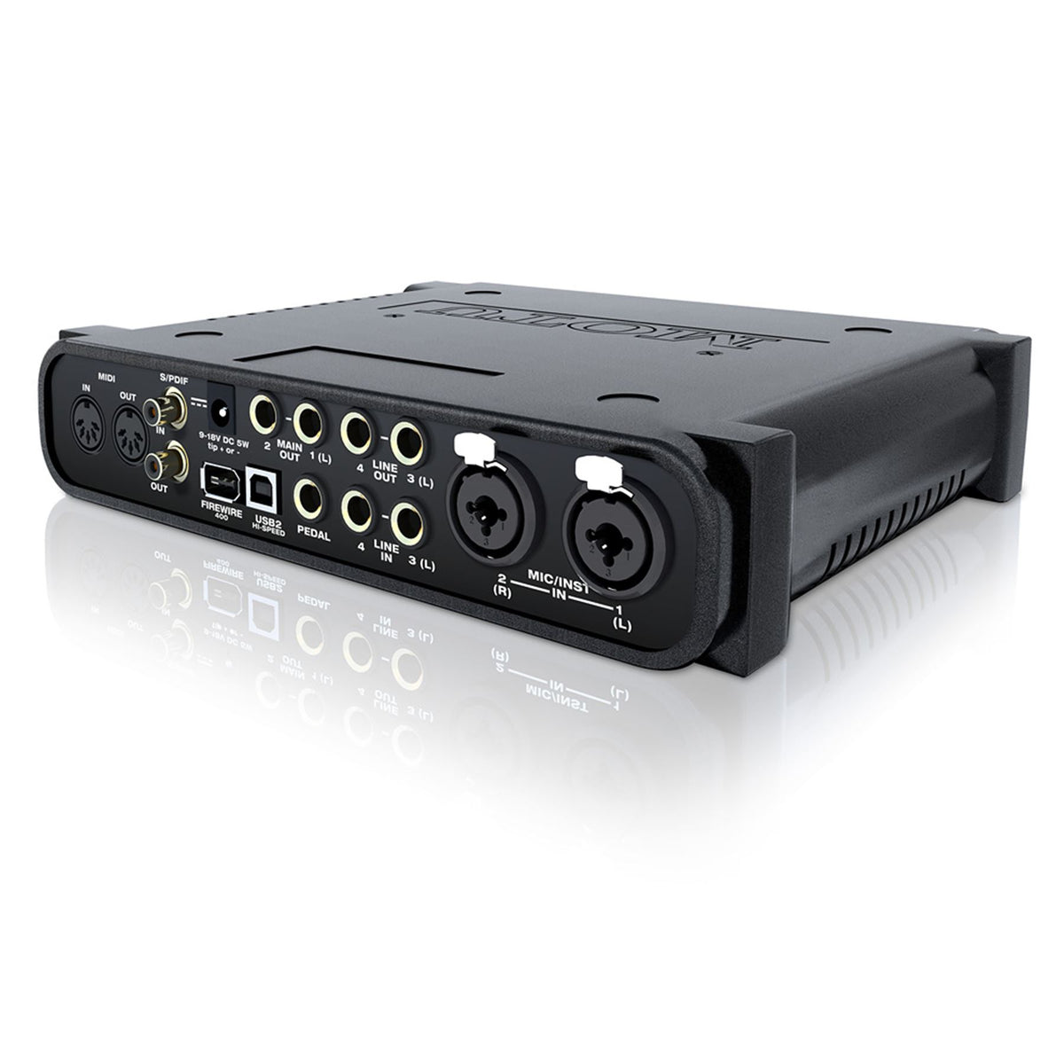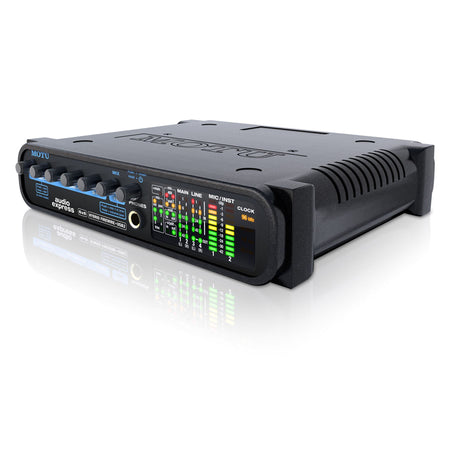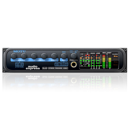 The Audio Express provides mobile operation and flexible connectivity to a Mac or PC via FireWire or USB2, with professional audio quality at sample rates up to 96 kHz and plenty of I/O, including two mic/instrument inputs, two line-level analog inputs, analog main outs, stereo S/PDIF, and a stereo headphone output.