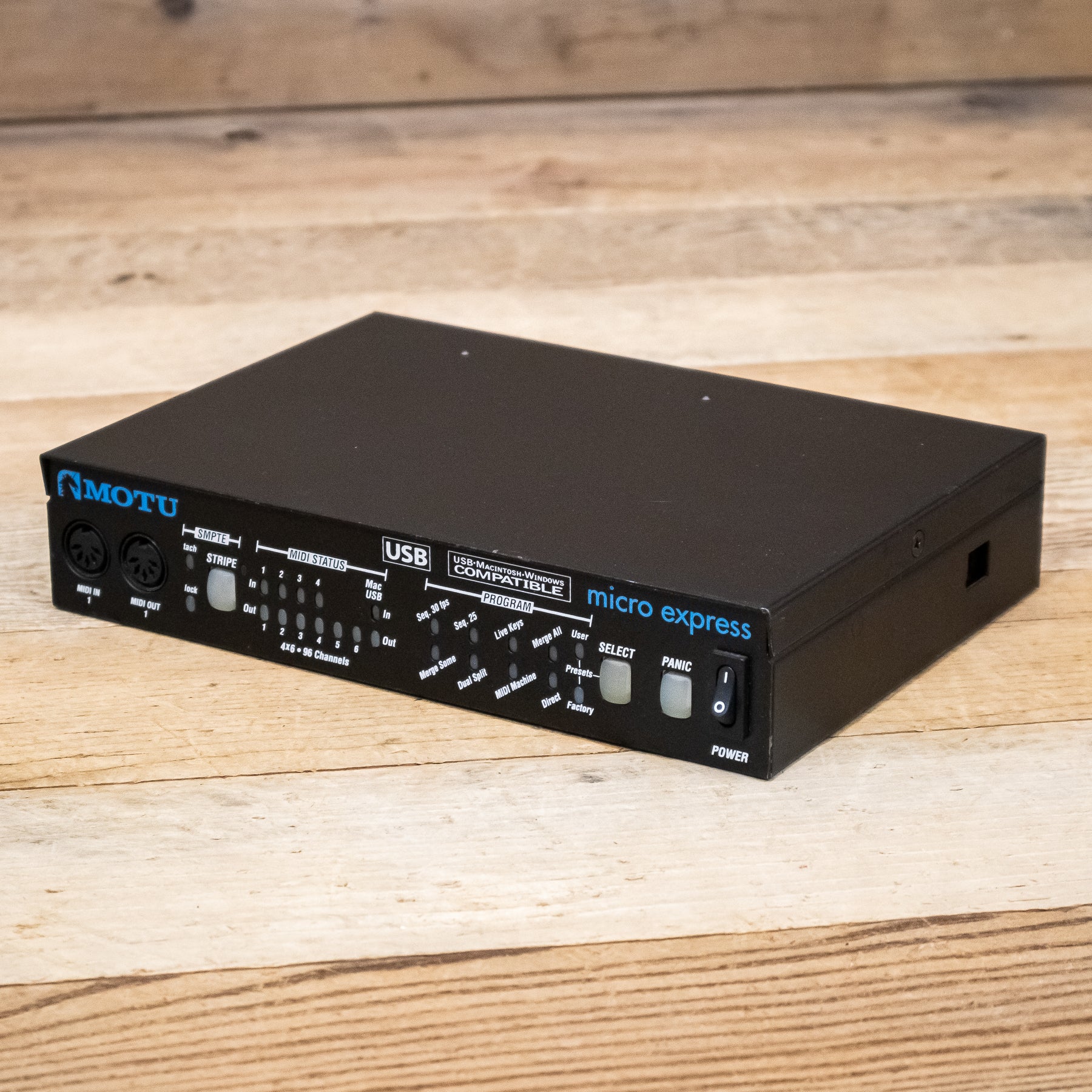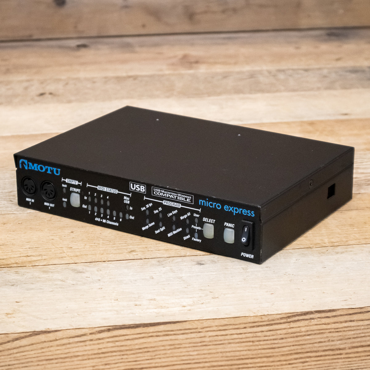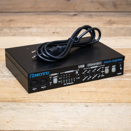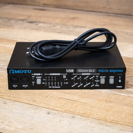 The MOTU Micro Express is a 4-in/6-out MIDI interface with SMPTE synchronization. Compatible with Windows (including Windows 64-bit) and Mac computers, and powered via USB bus, you can take the Micro Express anywhere.