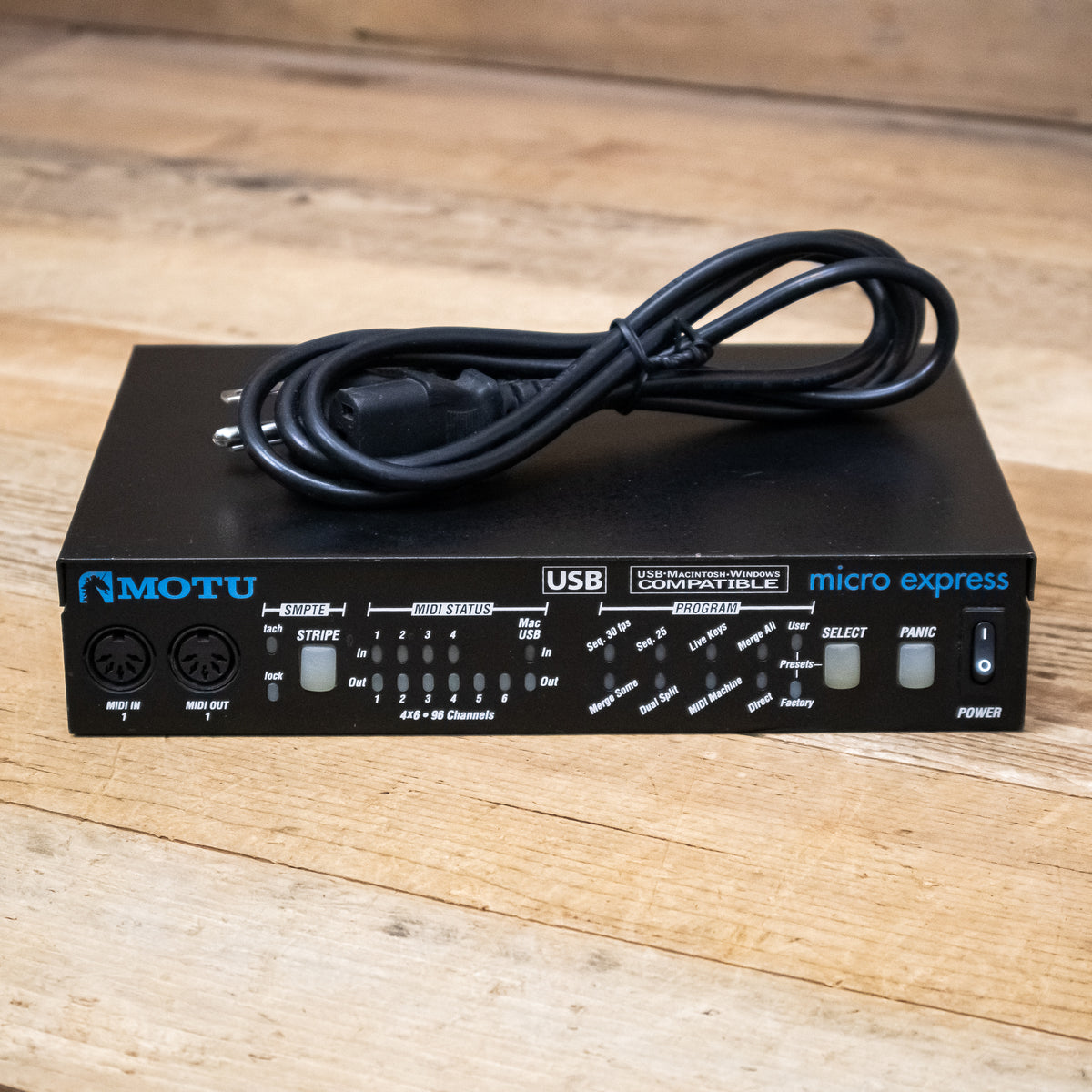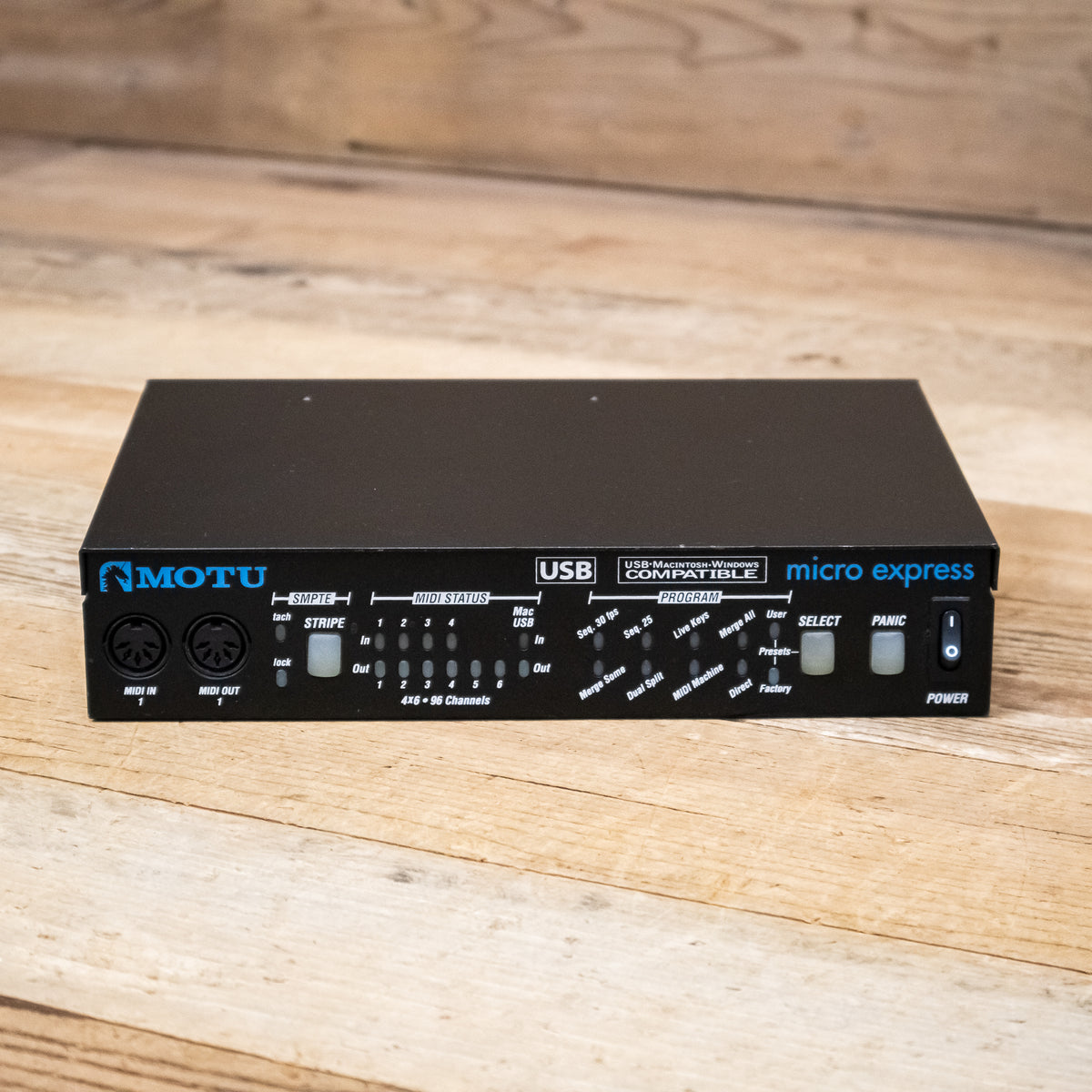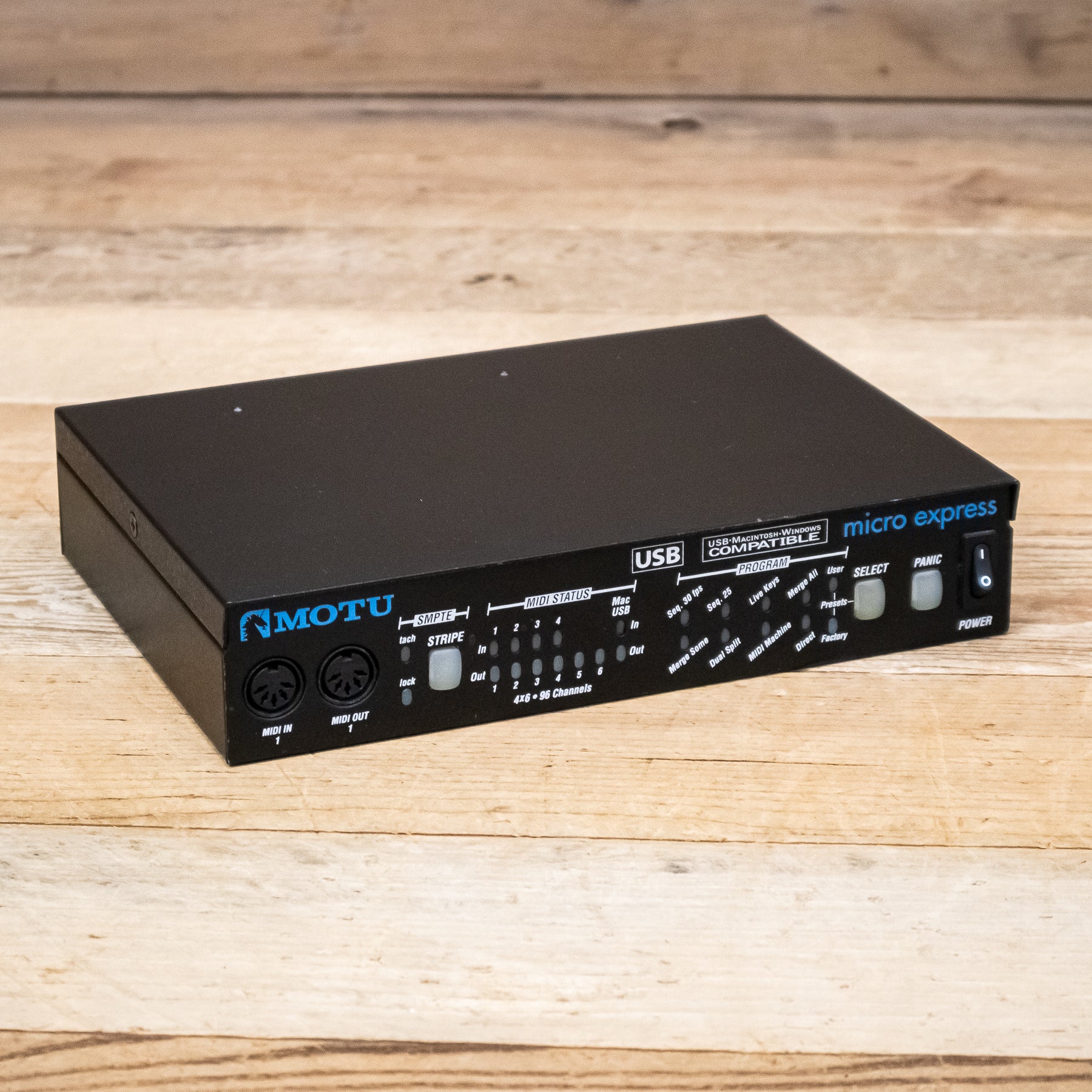 The MOTU Micro Express is a 4-in/6-out MIDI interface with SMPTE synchronization. Compatible with Windows (including Windows 64-bit) and Mac computers, and powered via USB bus, you can take the Micro Express anywhere.