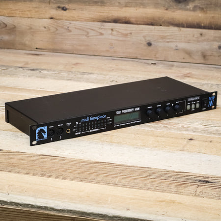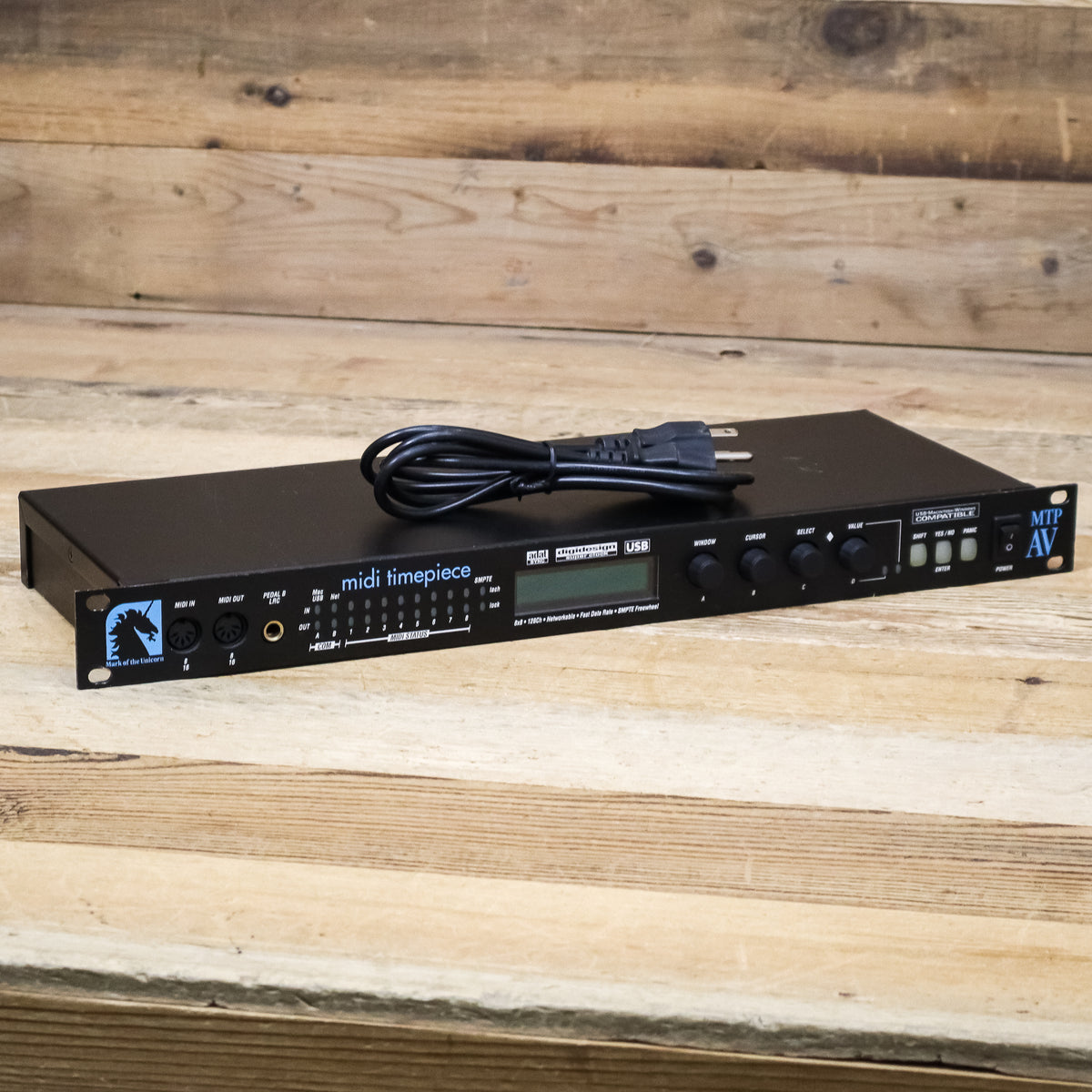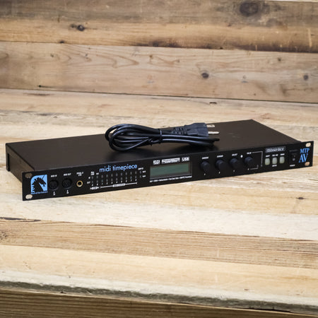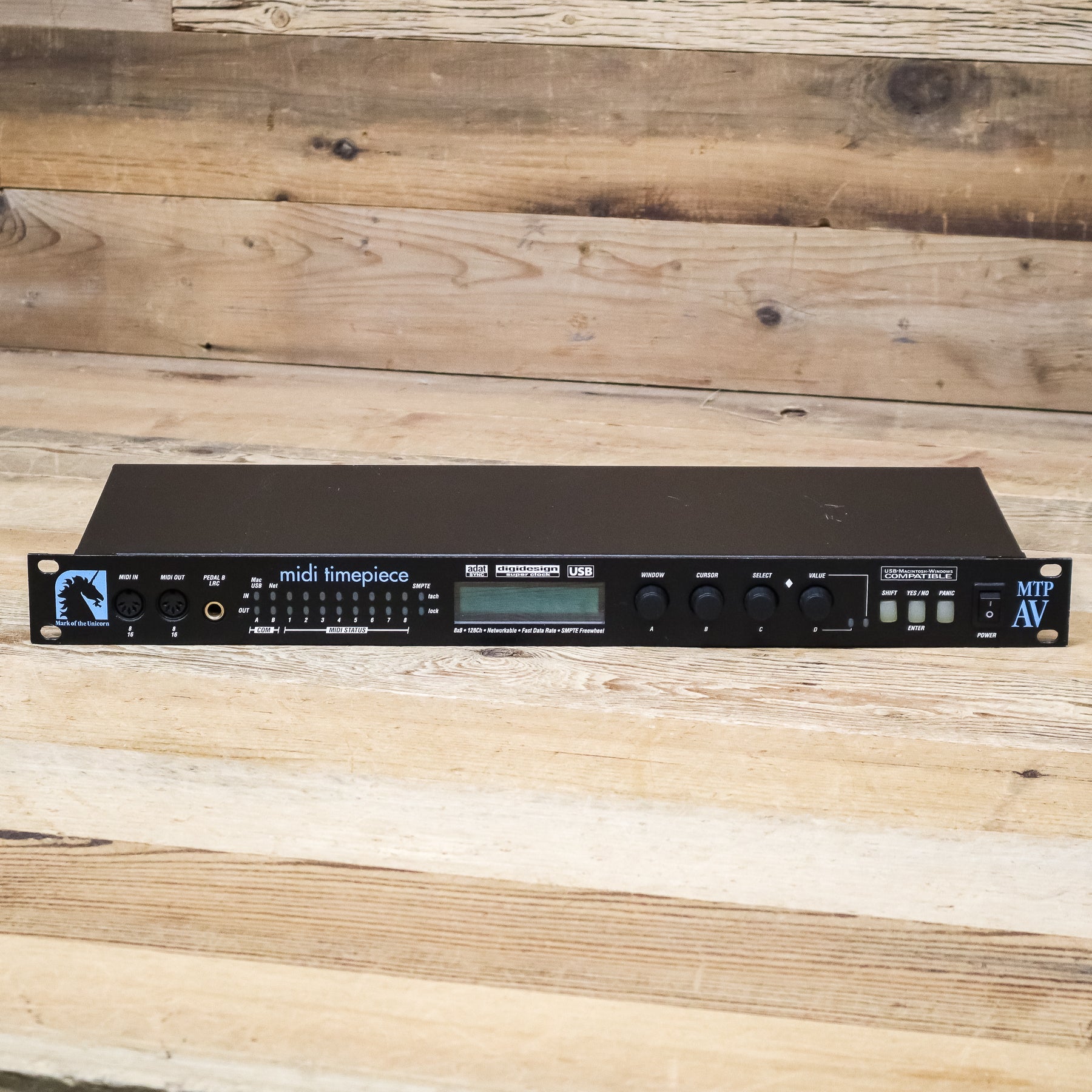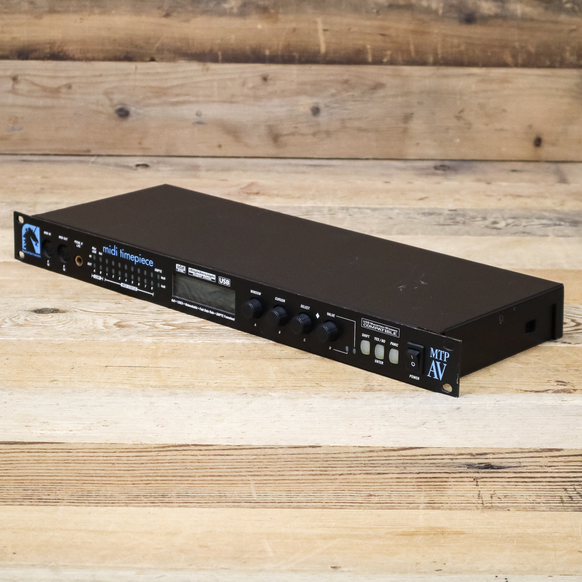 MIDI Timepiece AV is an 8x8 MIDI interface patchbay, and merger with synchronizer. Combine MIDI with ADATs, ProTools, and video. The MIDI Timepiece AV takes our world-renowned MIDI Time Piece II and adds synchronization that you really need, like video genlock, ADAT sync, and word clock sync. Even Digidesign superclock. Slave ADATs, Digidesign hardware or word-clock compatible devices to SMTPE and video. Drive your ADATs from your sequencer without an Alesis BRC. Or control everything from an MMC controller like JL Cooper's CuePoint. The MTP AV pulls it all together for stable, centralized, hassle-free synchronization and MIDI networking. For Macintosh, Windows, and stand-alone setups.