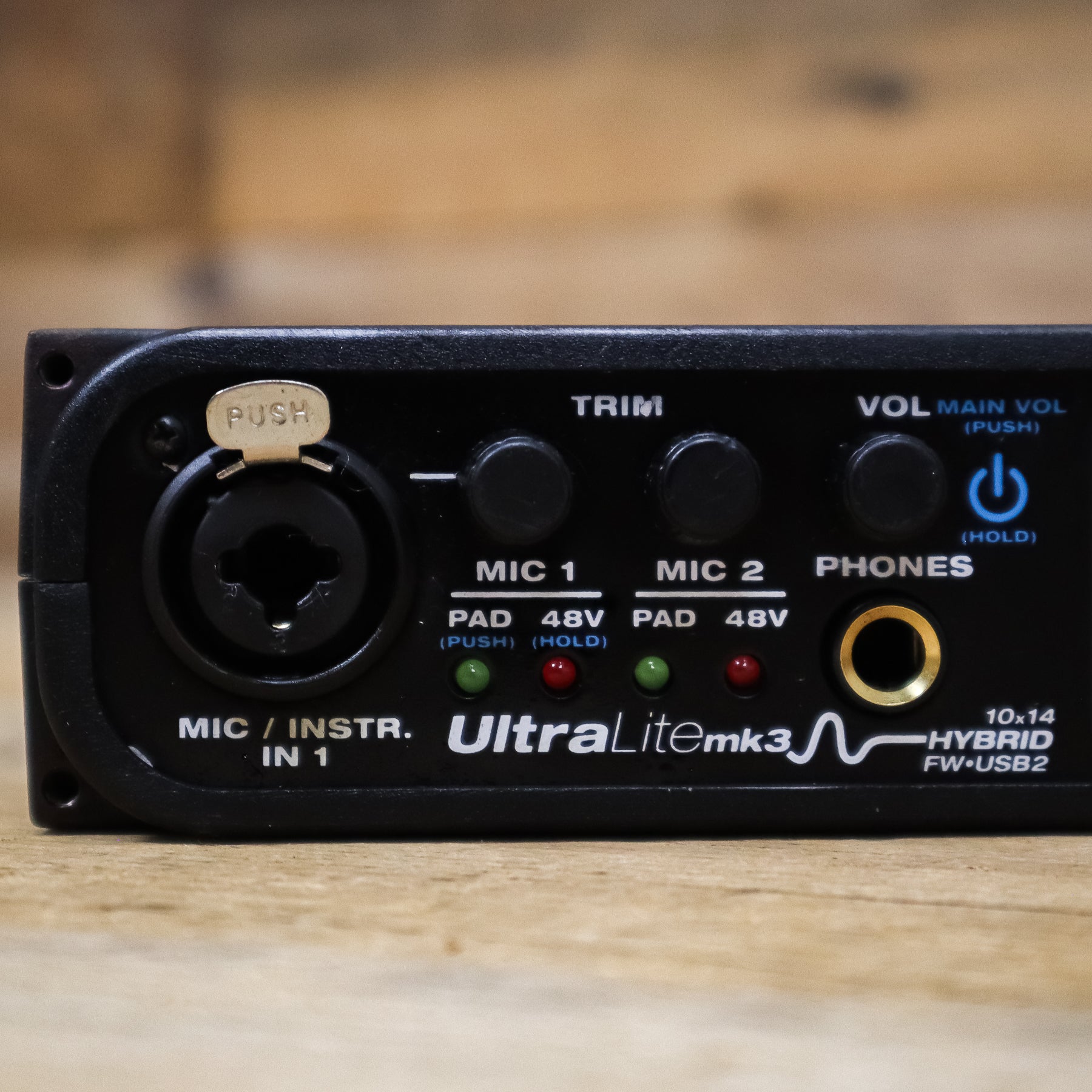 As the first-ever "hybrid" audio interface of its kind, the UltraLite-mk3 Hybrid provides flexible and mobile operation via FireWire or hi-speed USB2 connectivity to a Mac or PC computer, with professional audio quality at samples rates up to 192 kHz and plenty of I/O, including two mic/instrument inputs, six line-level analog inputs, ten channels of analog output, stereo S/PDIF and a stereo headphone output.