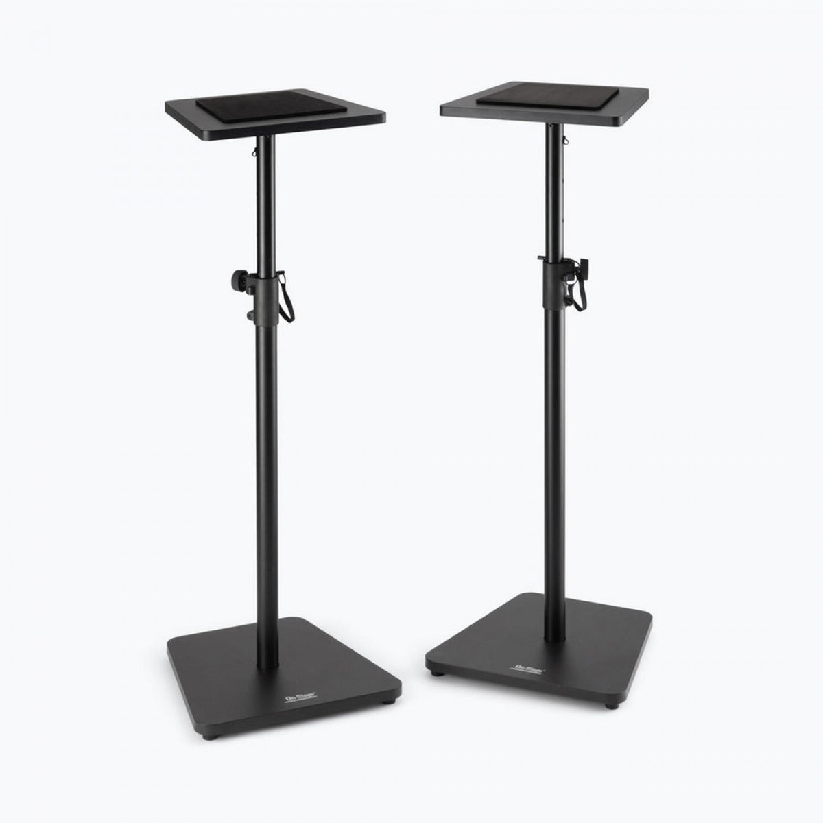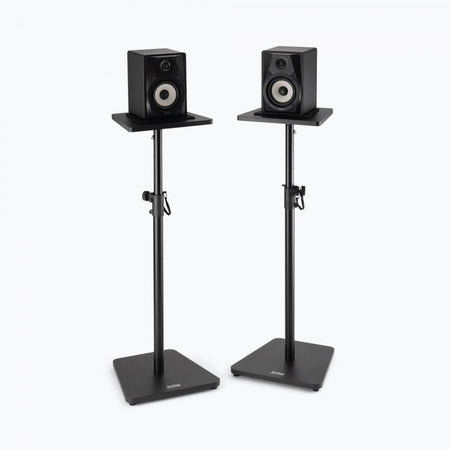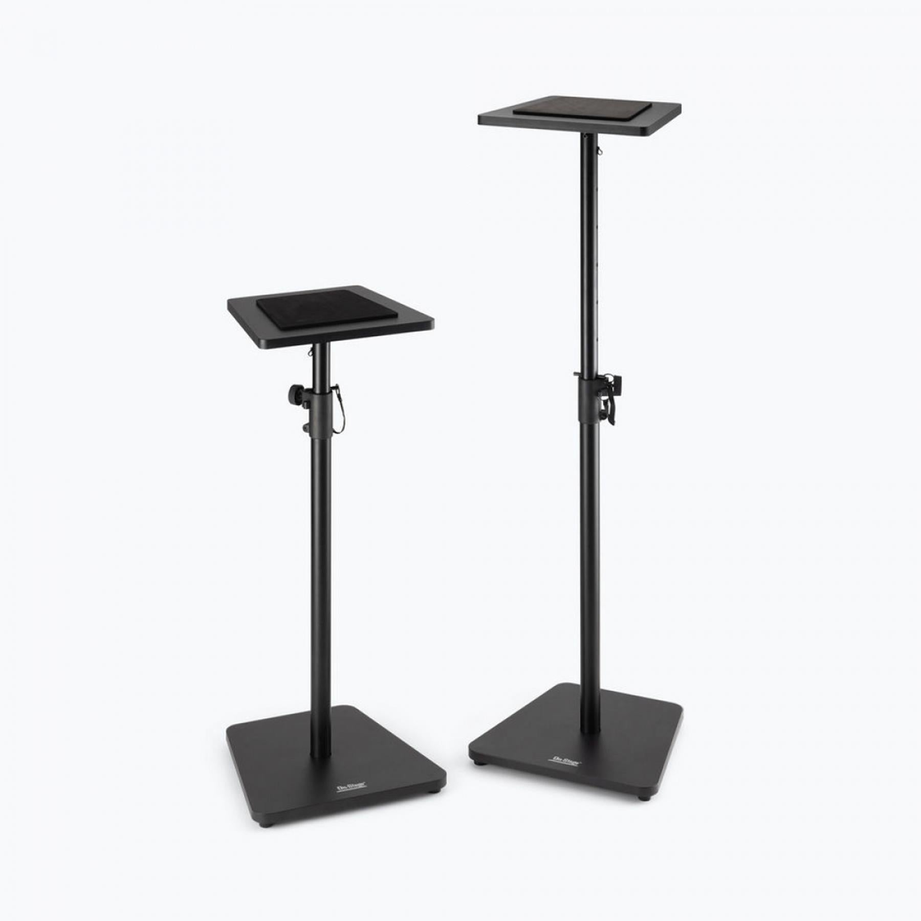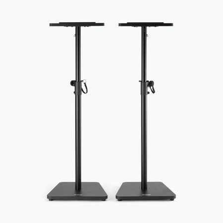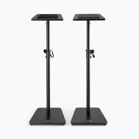 This pair of SMS7500 Wood Studio Monitor Stands reliably supports heavy monitor speakers weighing up to 90 pounds each, holding them at the desired level and angle for mixing, mastering, and playback. Made of wood and available in black or rosewood finishes, these sturdy stands deliver a refined, furniture-like visual presentation that enhances the professional appearance of any recording studio, home theater, or listening space. The height of each stand adjusts from 35.5 to 56.5 inches, enabling balanced, precise speaker placement that optimizes sound in a variety of spaces and accommodates listening while seated or standing. Nonslip padding on the platforms protects the speaker cabinets from dents and scratches, dampens vibrations to maintain the natural sound of the speakers, and prevents skidding or sliding to keep the speakers safely in place. The wide 16 inch bases sit flat and maximize contact with the floor for a solid foundation that provides outstanding stability on hard floors or carpets. Enjoy all the practical features you need along with the classic looks your space deserves.