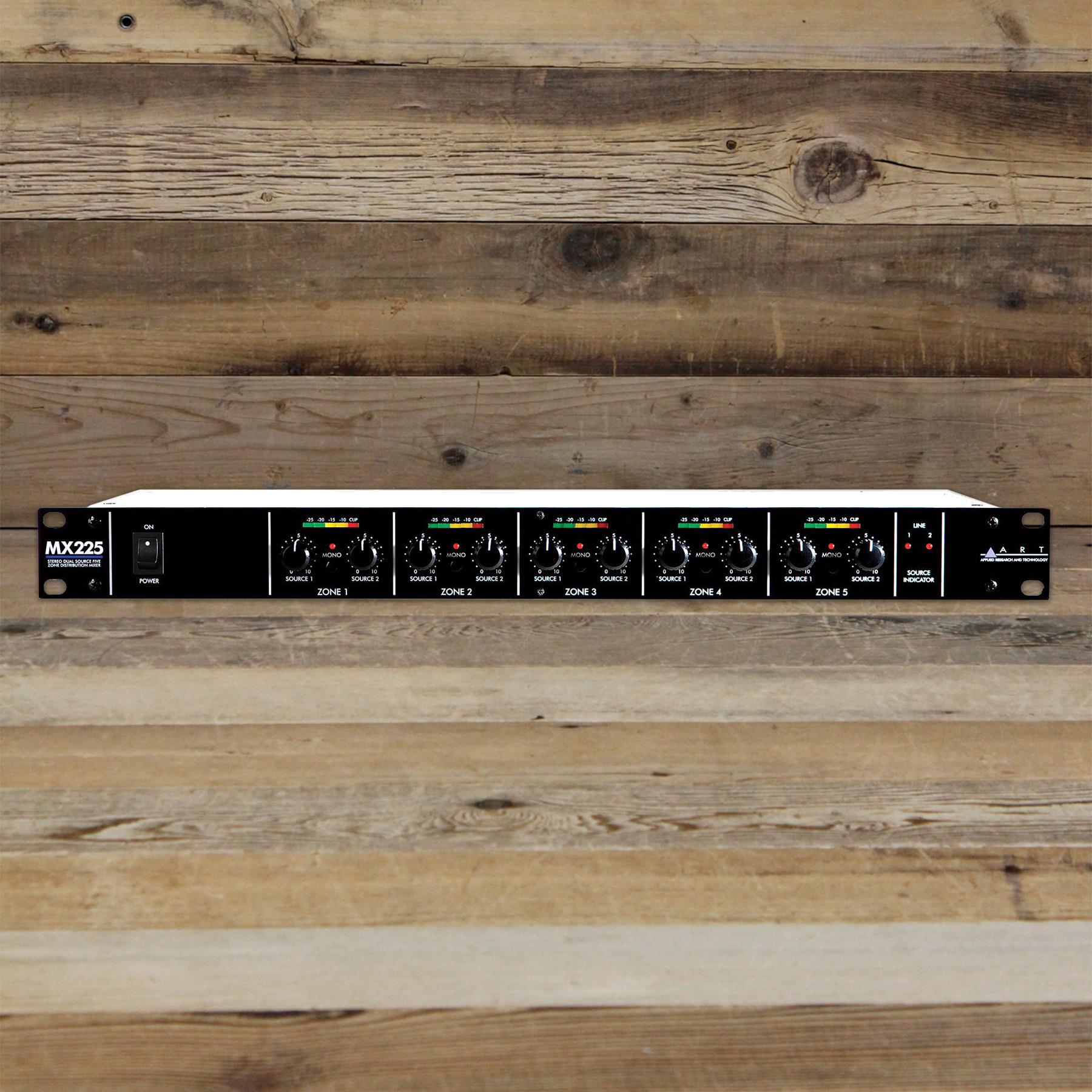 The MX225 is designed for remote volume control of multiple amplifiers or powered speakers in a distributed audio system. Two stereo sources are available to each of five output zones. Each source input pair handles separate left and right balanced line level signals. Each output zone features independent level control from inputs 1 and 2, stereo/mono selector with mono indicator, LED level metering, and left and right balanced line level zone outputs. All audio connections are balanced XLR. The built in power supply and single high 19" rack mount format allows for easy installation and reliable operation.