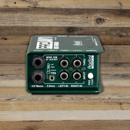 The Radial ProAV1 is a passive direct box specifically developed with the audio-video integrator in mind. The ProAV1 features a variety of stereo inputs that are summed mono via a resistive mixer, greatly simplifying signal management.