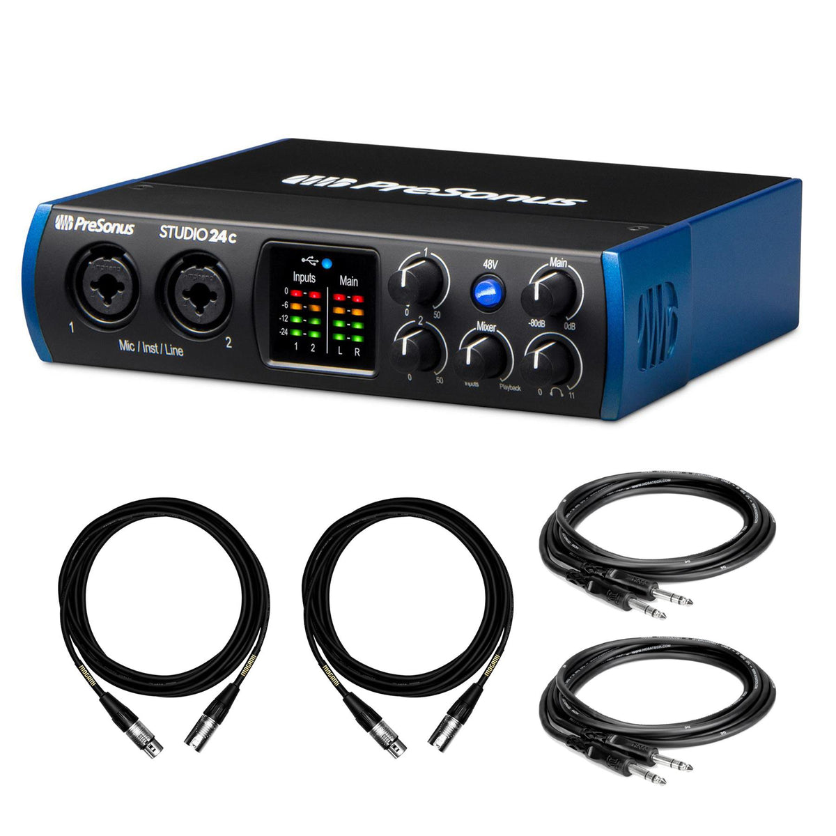 This bundle includes the PreSonus Studio 24C USB-C Audio Interface which includes Studio One Artist, two (2) 15-foot Mogami MCP XX 15 CorePlus XLR Cable, and two (2) 5-foot Hosa CSS-105 1/4"; Balanced TRS Cables.