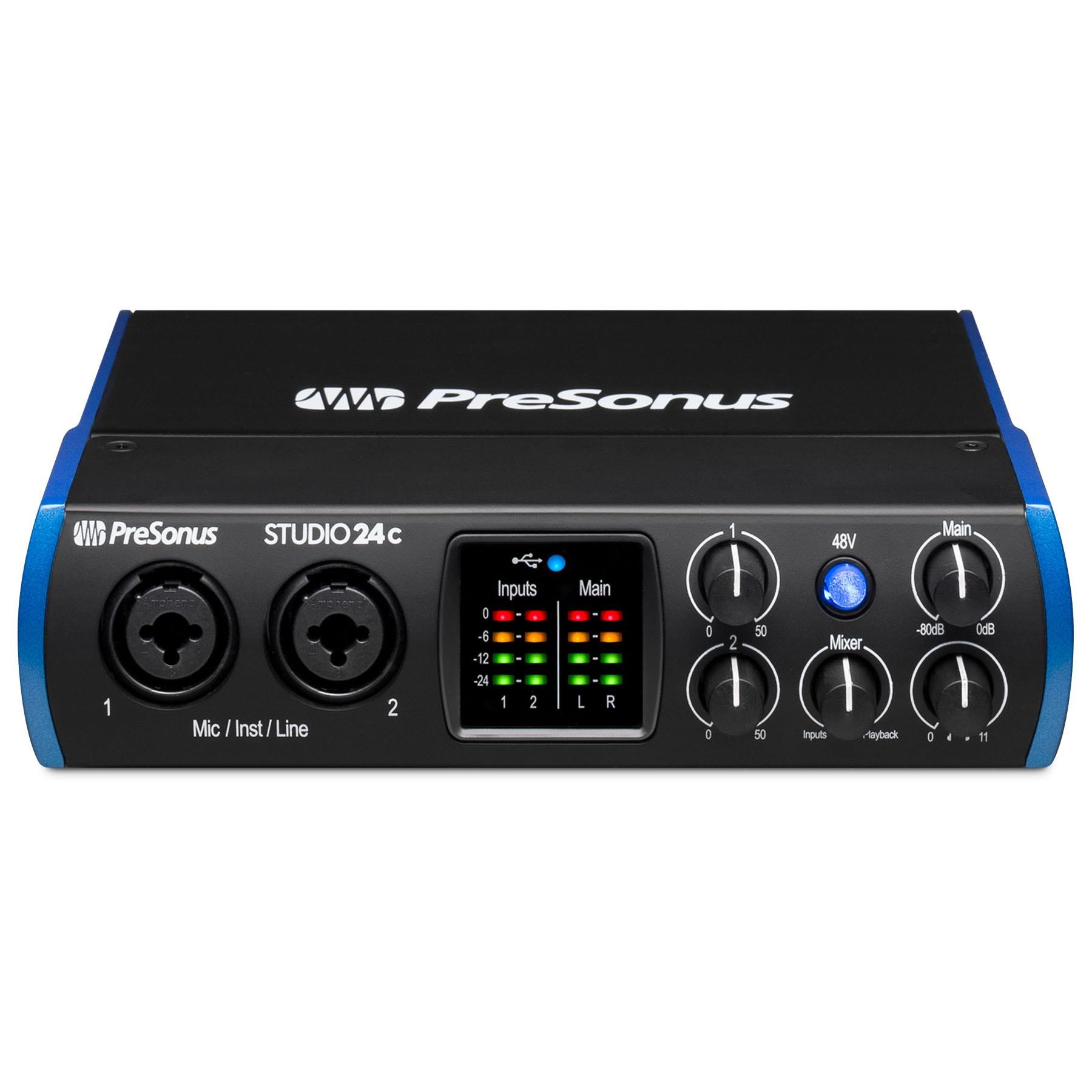 PreSonus Studio USB-C Series 24-bit, 192 kHz audio interfaces are complete, all-in-one recording systems. USB-C audio/MIDI interface, 2-in/2-out, 24-bit/192kHz with 2 mic/line/instrument XMAX-L preamps, USB bus power, and Studio One Artist recording and production software (Mac and Win)