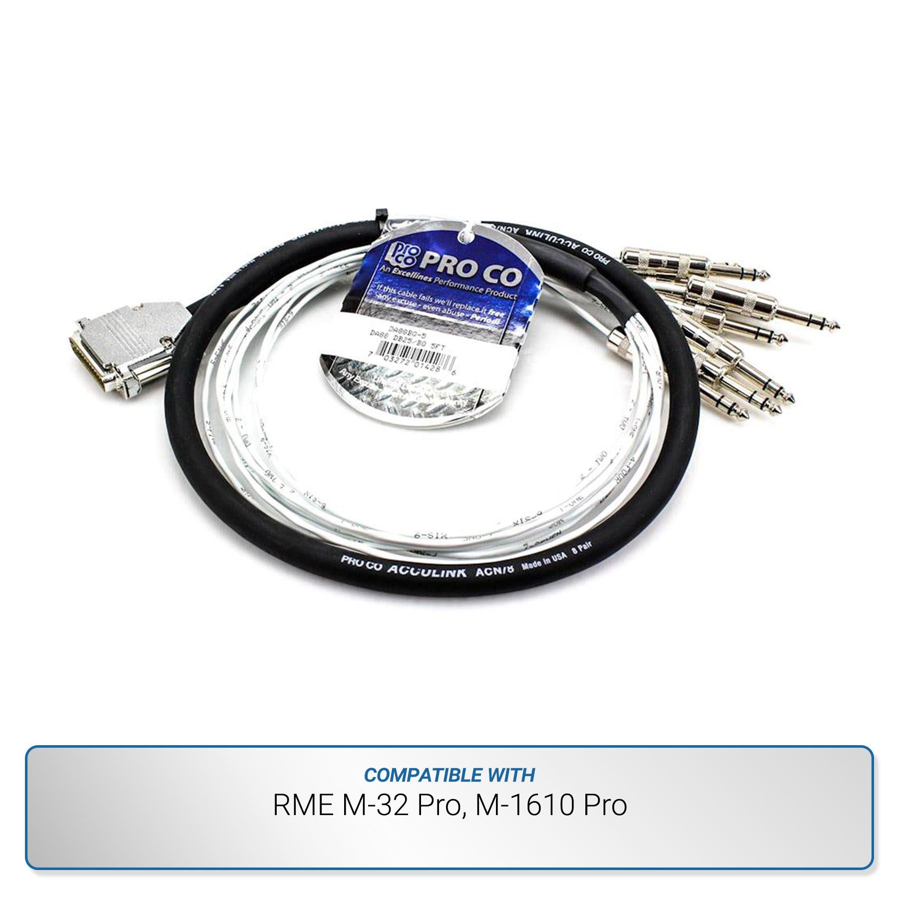 This 5-foot Pro Co Excellines DB25 to TRS Analog 8-Channel Snake is compatible with the RME M-32 Pro and M-1610 Pro.