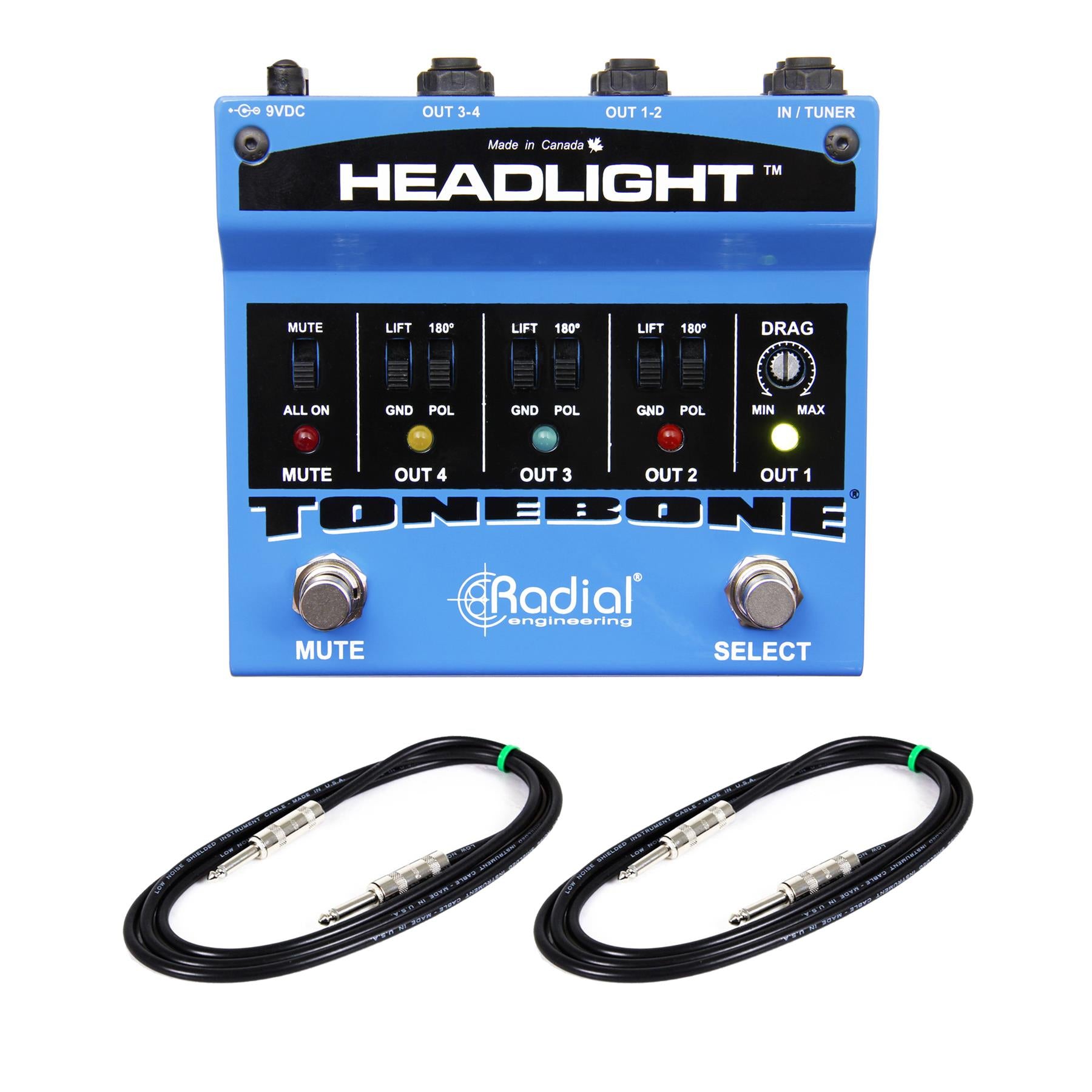 This bundle includes the Radial Tonebone Headlight and two (2) 6-Foot Rapco SEG-6 Staqemaster 1/4"; TS Instrument Cables.