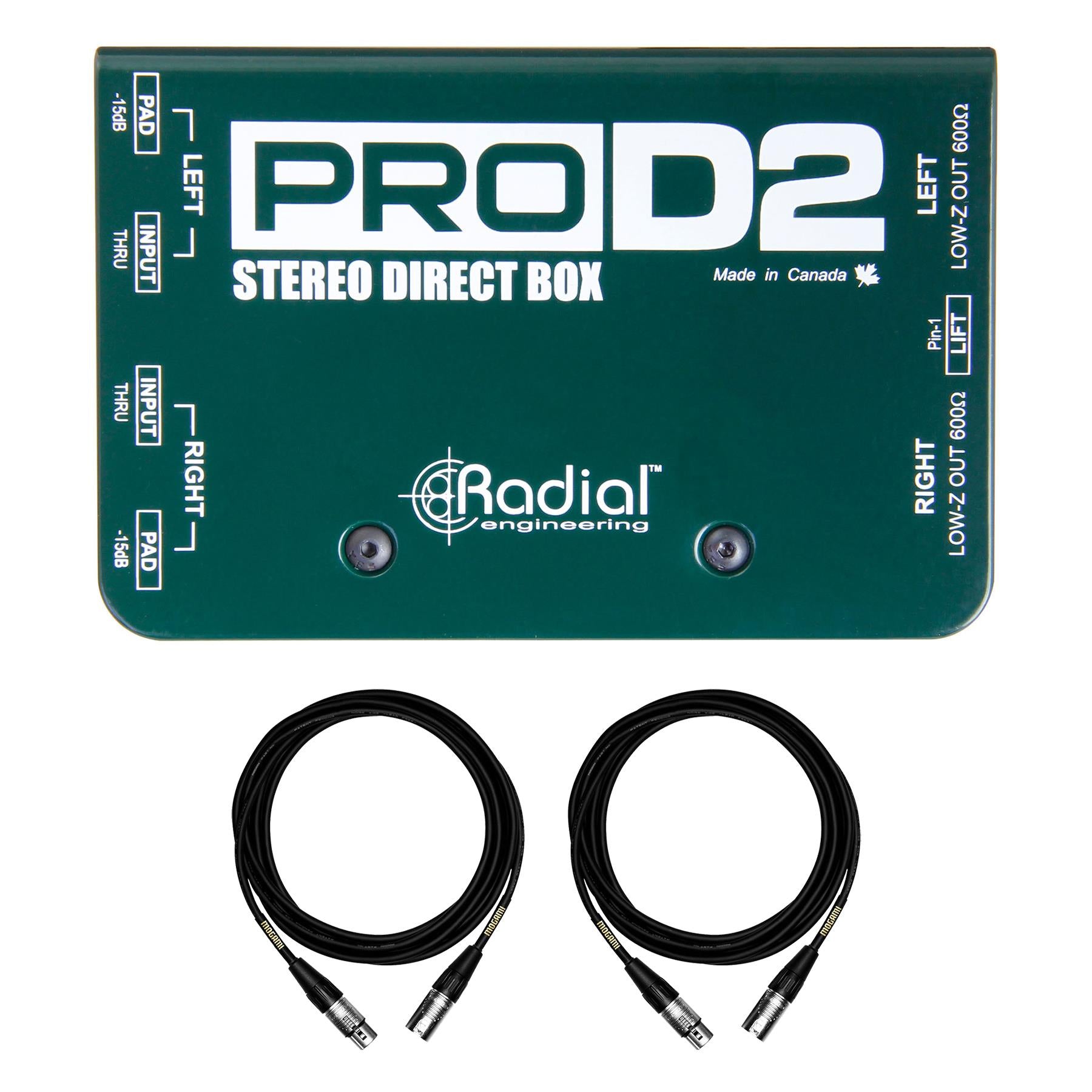 This bundle includes the Radial Engineering ProD2 and two Mogami MCP XX 15 CorePlus 15-Foot XLR Mic/Line Cables.