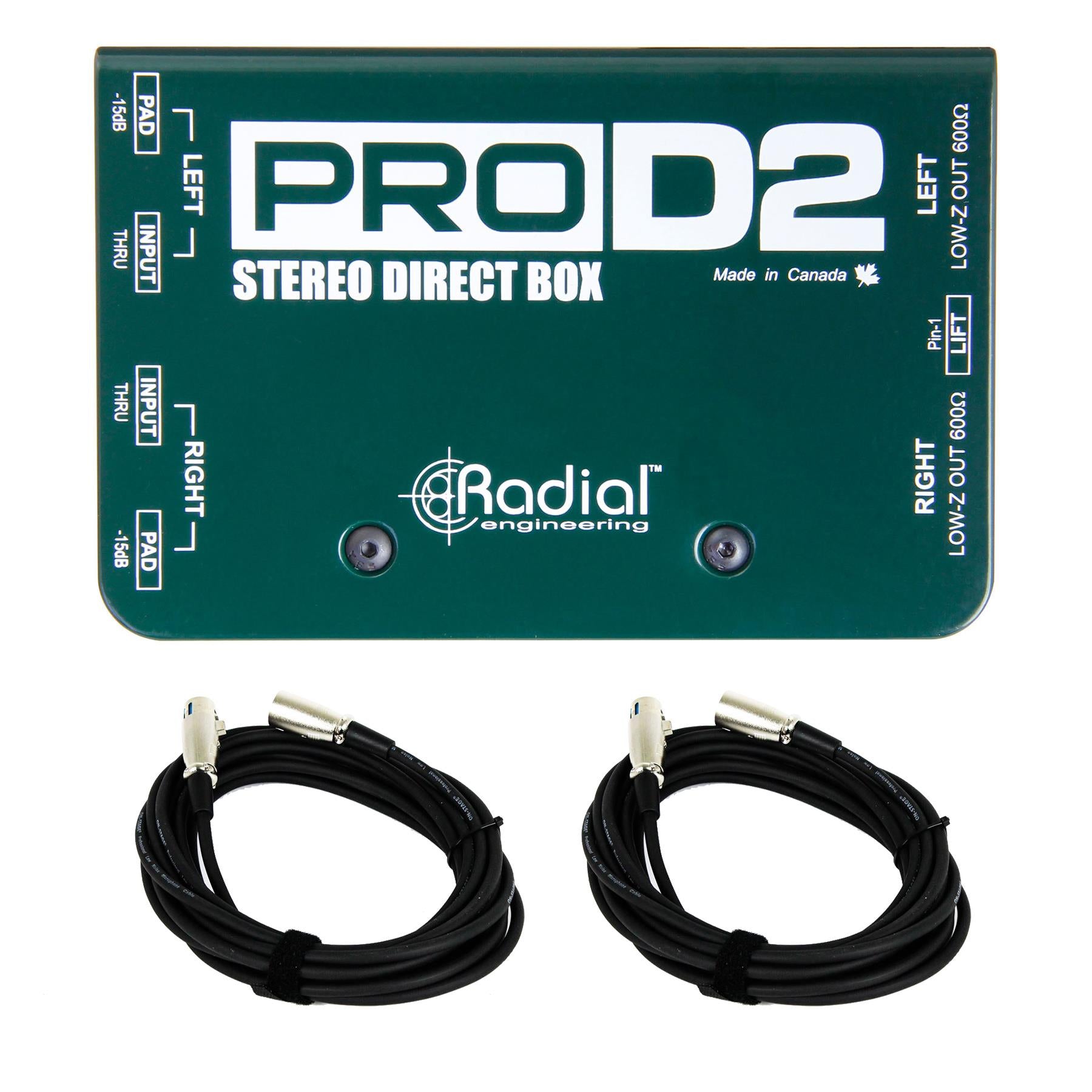 This bundle includes the Radial Engineering ProD2 and two 20-foot XLR Cables.