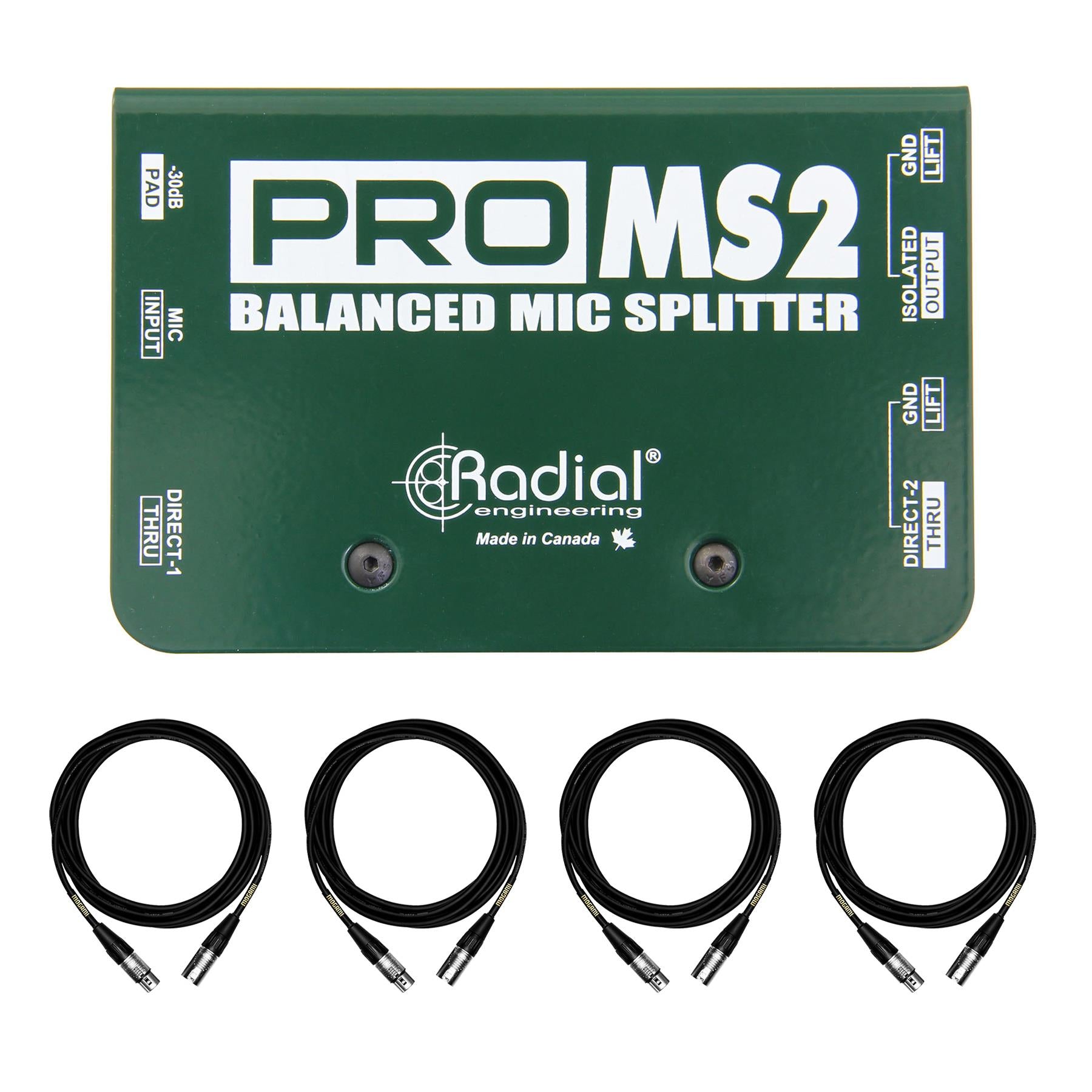 This bundle includes the Radial Engineering ProMS2 Passive Microphone Splitter and four Mogami MCP XX 15 CorePlus 15 Foot XLR Mic/Line Cables.