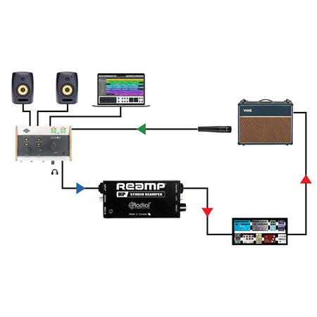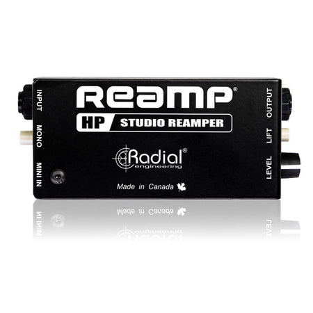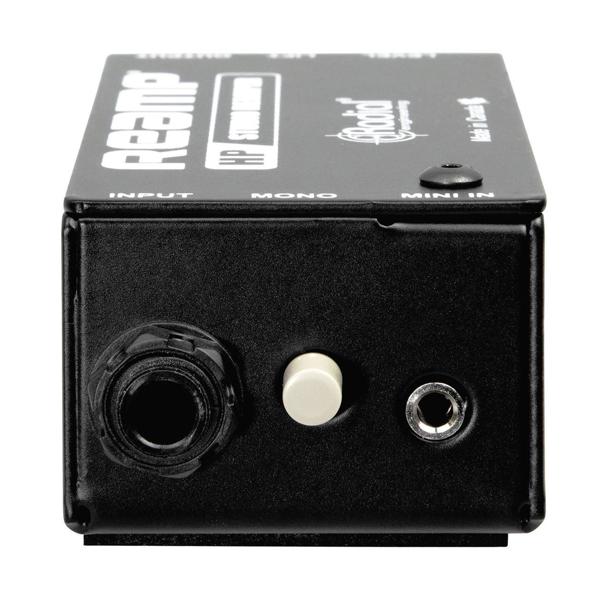 The Reamp HP takes the signal from a headphone output jack on an audio interface or a mobile device and converts it to feed mono guitar amps and effects pedals for Reamping.