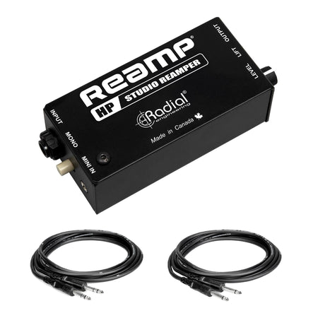 This bundle includes the Radial Engineering Reamp HP Studio Reamper, a 10-Foot Hosa CSS-110 1/4" TRS Balanced Cable, and a 10-Foot Hosa CPP-110 1/4" TS Unbalanced Cable.