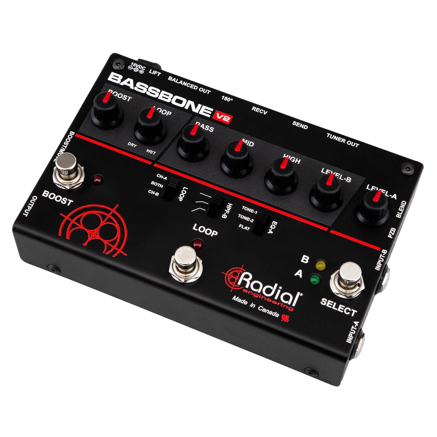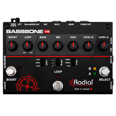 With the Bassbone V2, you get even more: A boost footswitch can be used to either engage a power booster for solos or can be assigned as a mute switch for quiet on-stage tuning. A third footswitch lets you activate the effects loop which is equipped with a wet-dry control to retain the tone of the original instrument and then mix-in as much of the effect as you like. The effects can be assigned to either channel or both. Once processed, you can send your sound to a stage amp, tuner and to the PA system using the built-in Radial DI box.