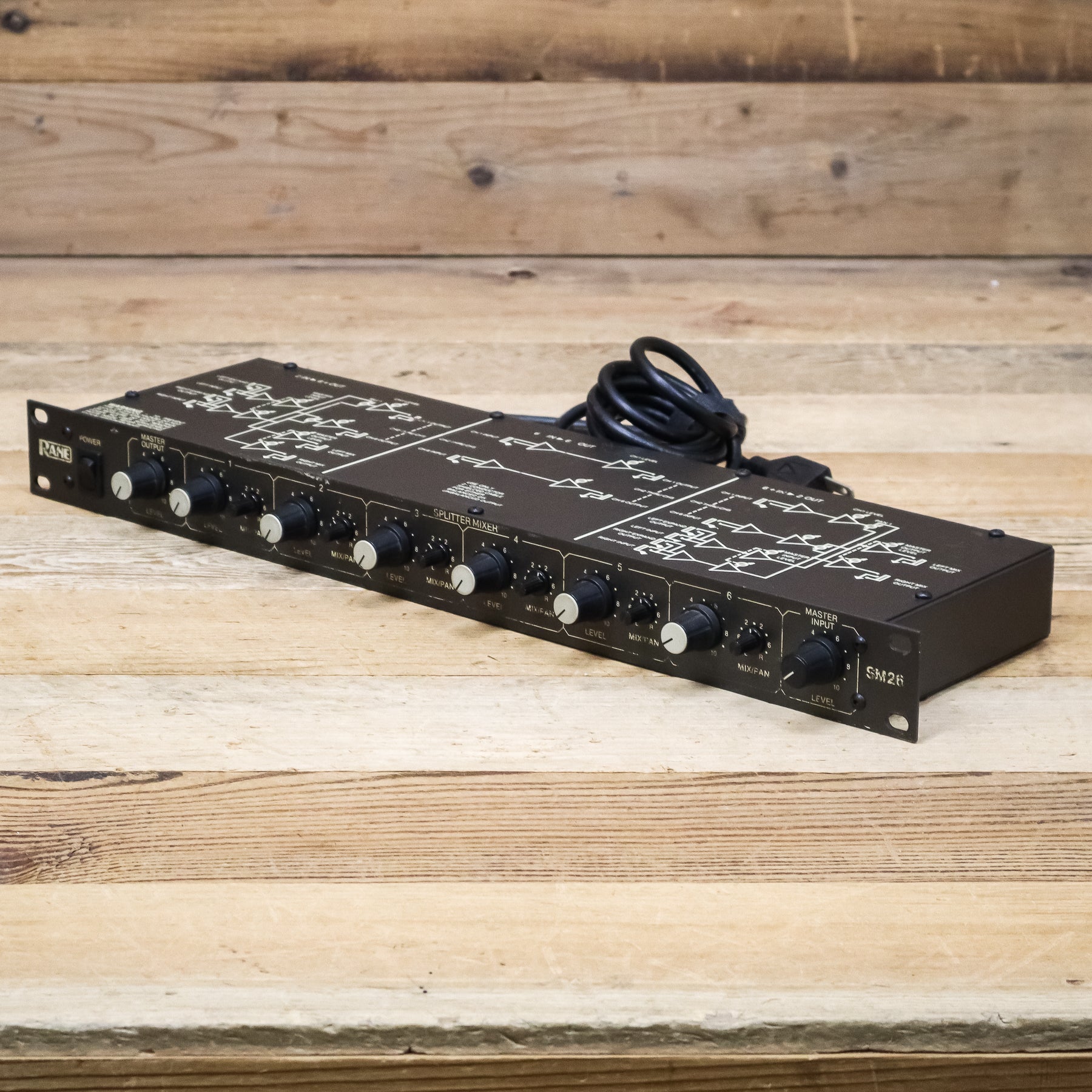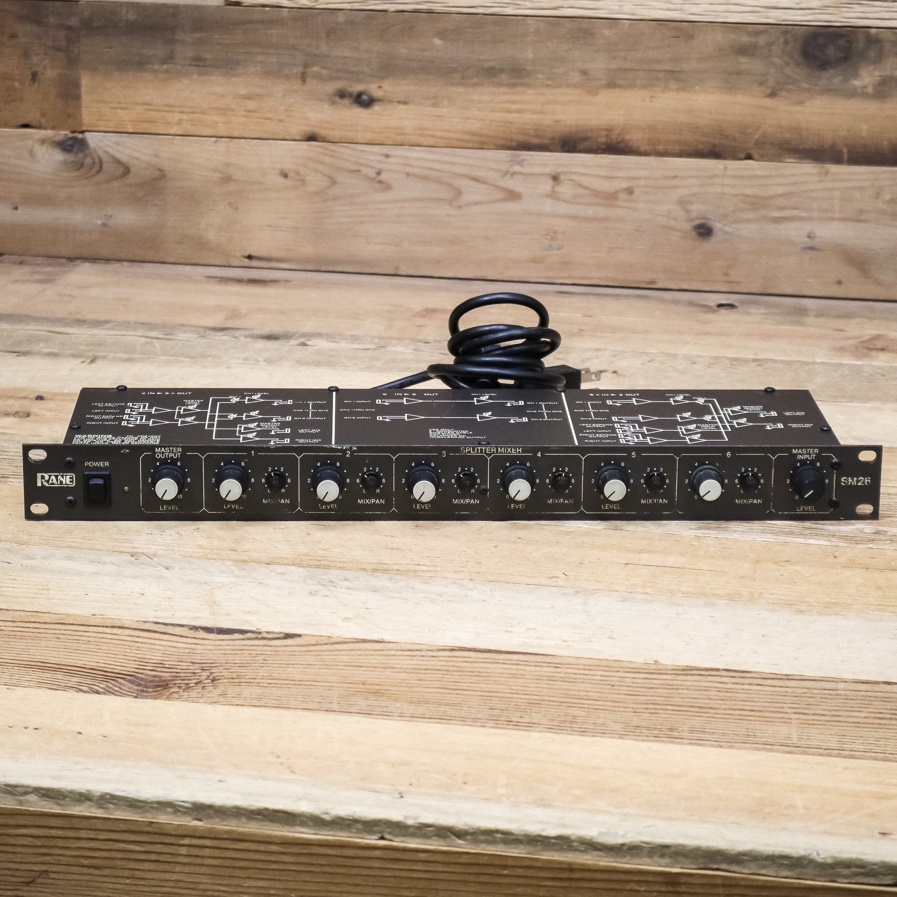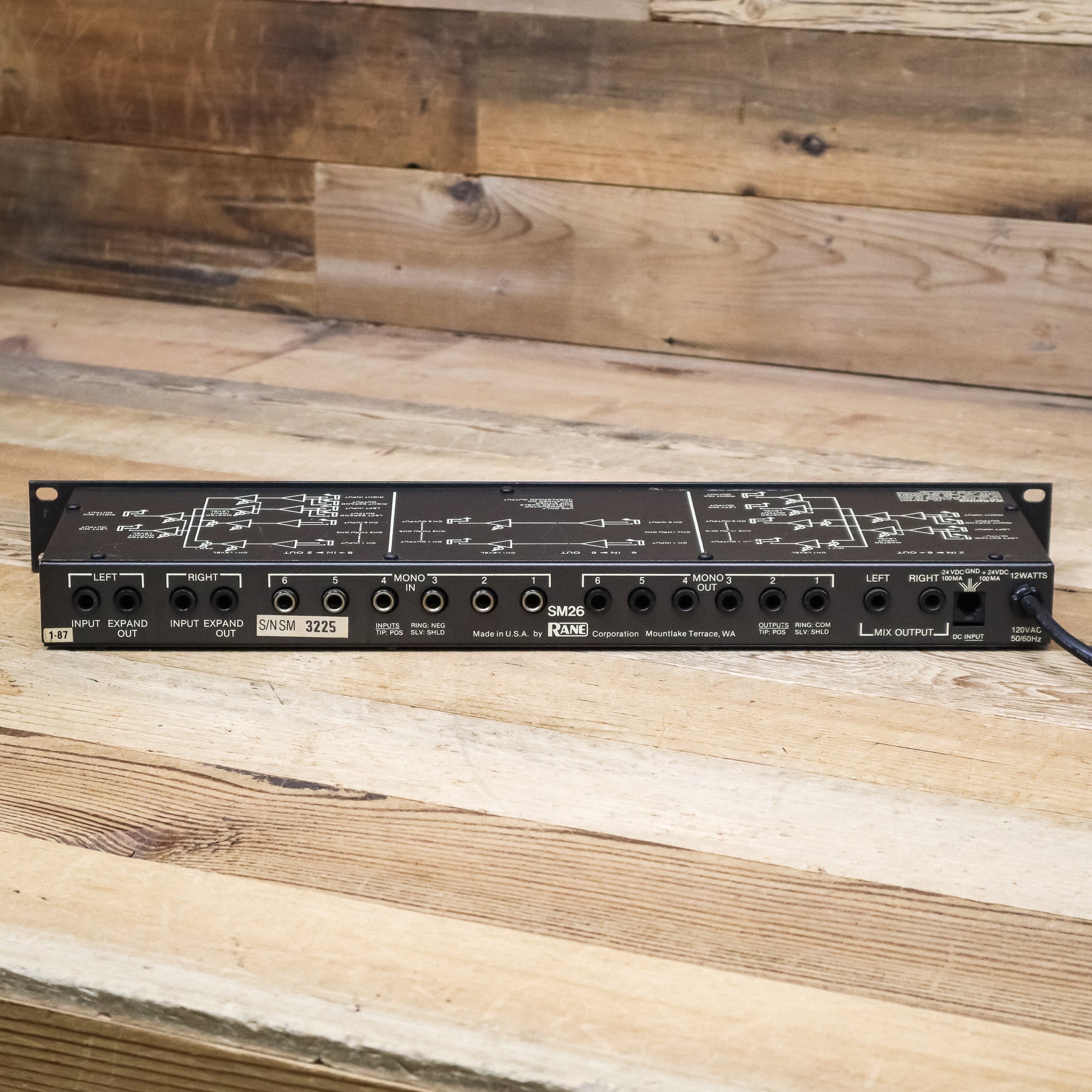 The front of the SM26 comprises a Master Input Level control, six Channel Level controls, six Mix/Pan controls and a Master Output Level control. The rear of the SM26 provides two Master Left and Right Inputs, six Mono Inputs, six Mono Outputs and two Master Left and Right Mix Outputs. All Inputs and Outputs on the SM26 are 1/4" TRS active balanced.