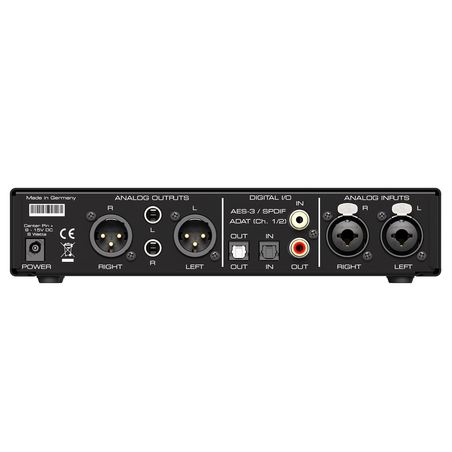 But the ADI-2 has more to offer than tremendous sound. It also provides exciting digital connectivity. Its coaxial RCA SPDIF I/O has a switchable Channel Status to make it fully AES/EBU compatible (cable adapter required). The optical TOSLINK I/Os can handle up to 192 kHz and also serve as ADAT I/O, even at 192 kHz. An operation with SPDIF input and ADAT output or vice versa is supported, in both AD/DA and D-D mode.